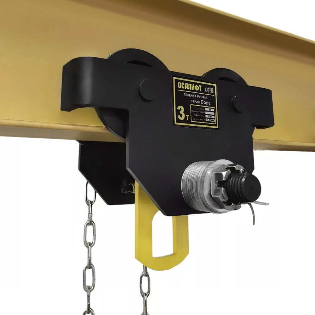 Устанавливается на двутавровую балку для подвеса тали за крюк и перемещения груза вдоль двутавра