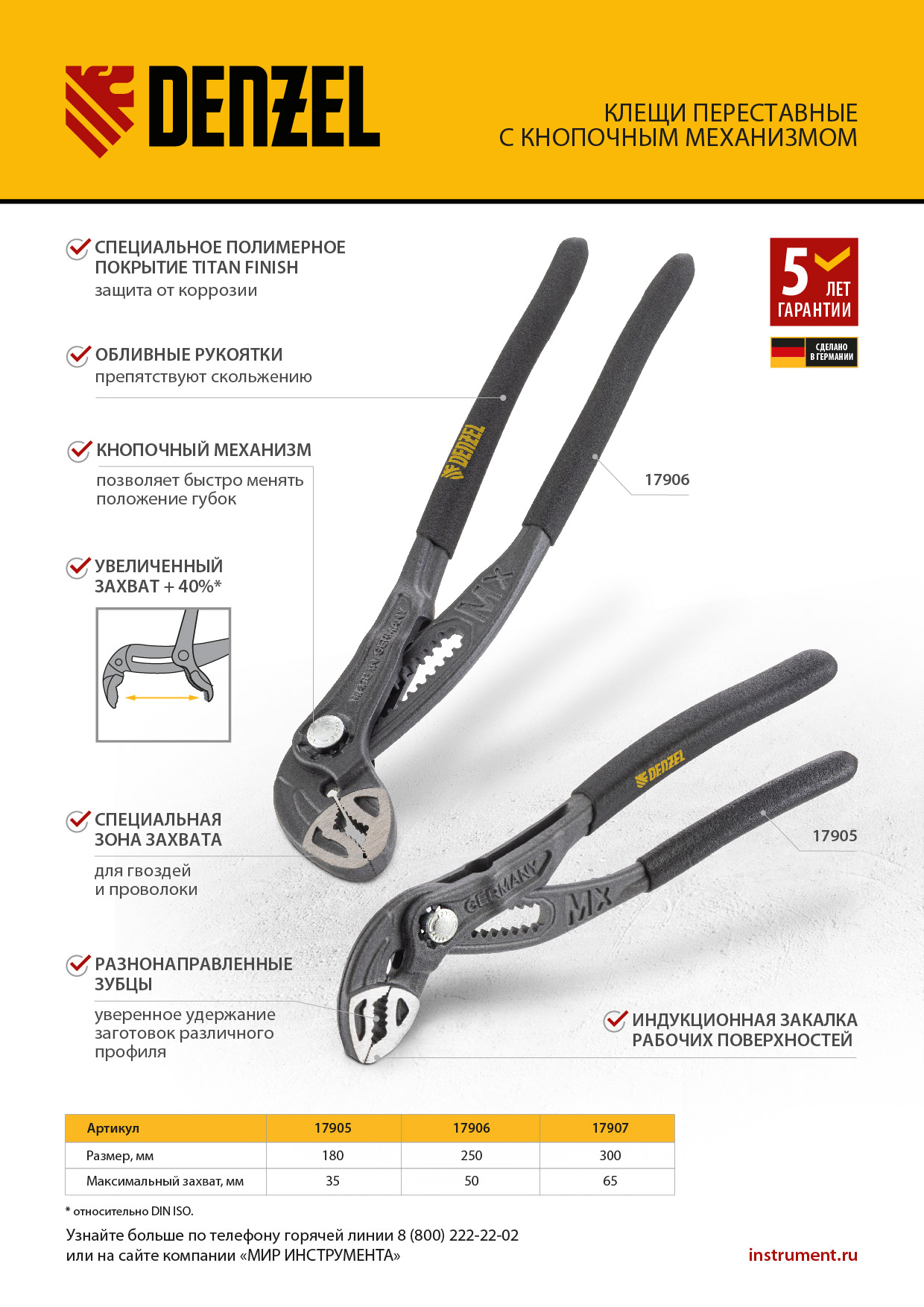 Клещи переставные, кнопочный механизм, обливные рукоятки, 250 мм Denzel в Уфе