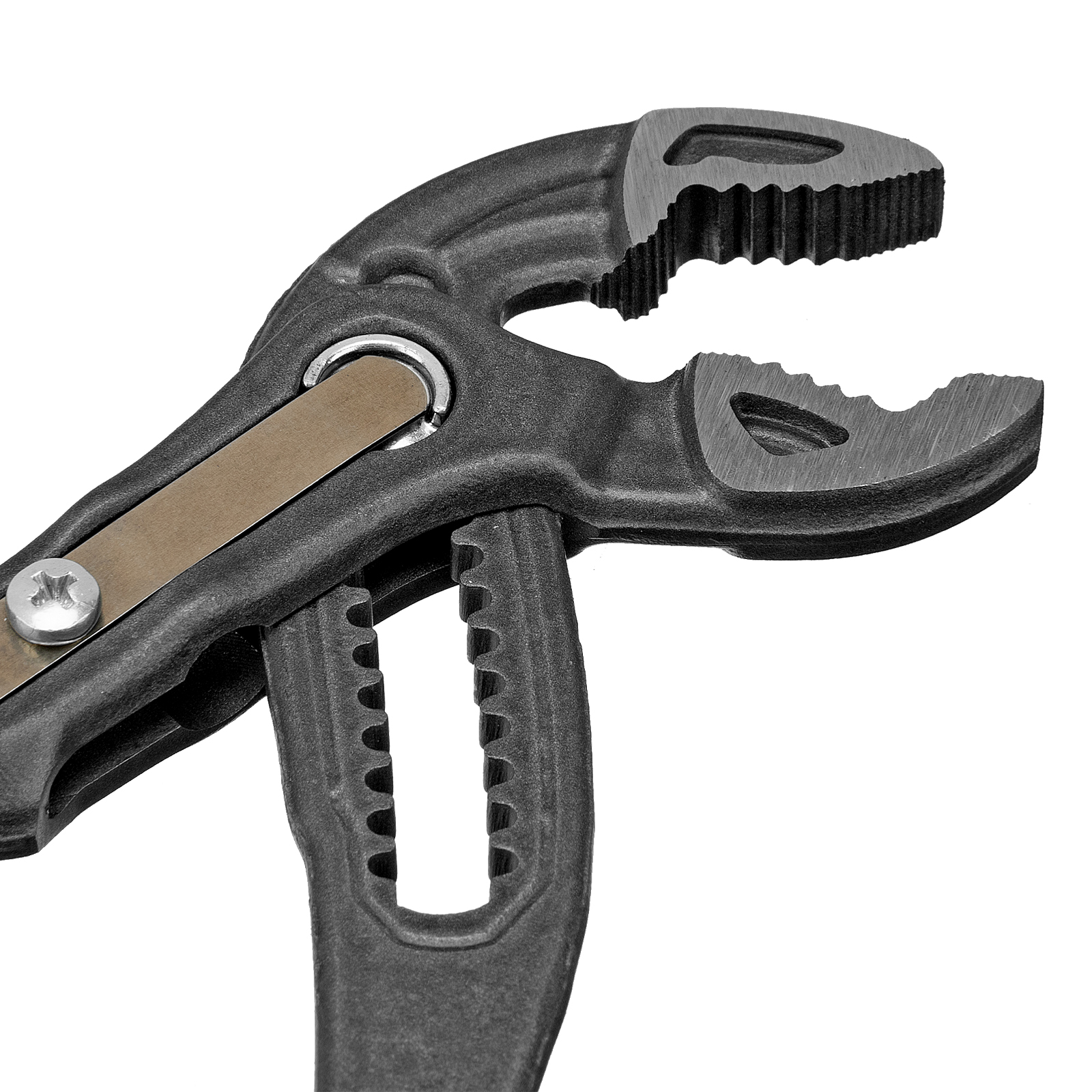 - Удобная работа с деталями разного размера — кнопочный механизм позволяет быстро менять положение губок и фиксировать их в нужном положении.