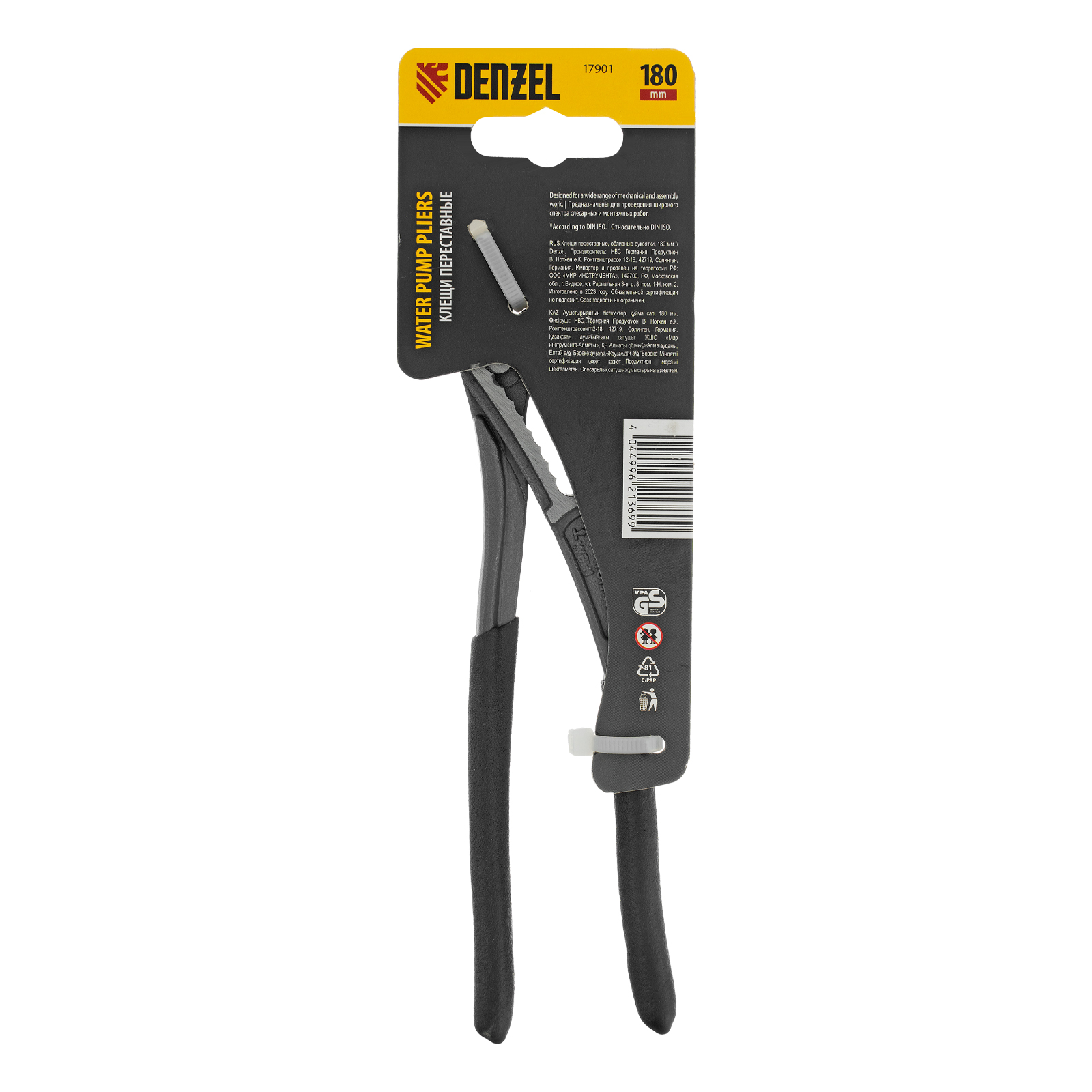 Переставные клещи Denzel 17901 длиной 180 мм, с обливными рукоятками, предназначены для фиксации и вращения деталей и заготовок различной формы. Подходят для захвата фитингов, труб, крепежных элементов. Инструмент используется при проведении ремонтных, монтажных, сантехнических работ.