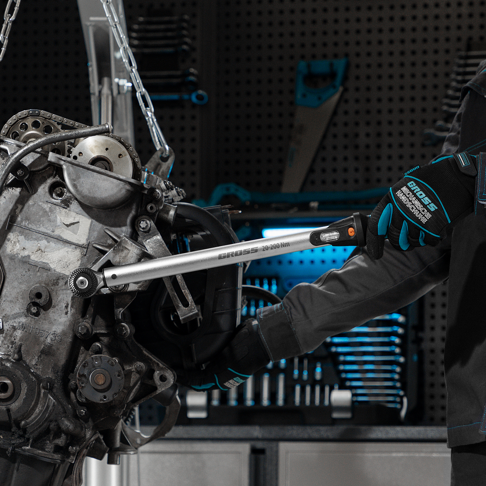 Динамометрический ключ Gross 14181 с посадочным квадратом 1/2", из стали CrV, используется для закручивания резьбового крепежа с точно заданным усилием в диапазоне от 20 до 200 Нм. Оснащен индикатором настройки крутящего момента, обладает повышенной точностью, погрешность составляет +-3%. Момент силы контролируется щелчковым механизмом, что облегчает работу в условиях отсутствия визуального контроля. Инструмент применяется для сборки и ремонта техники, а также для обслуживания автомобилей.