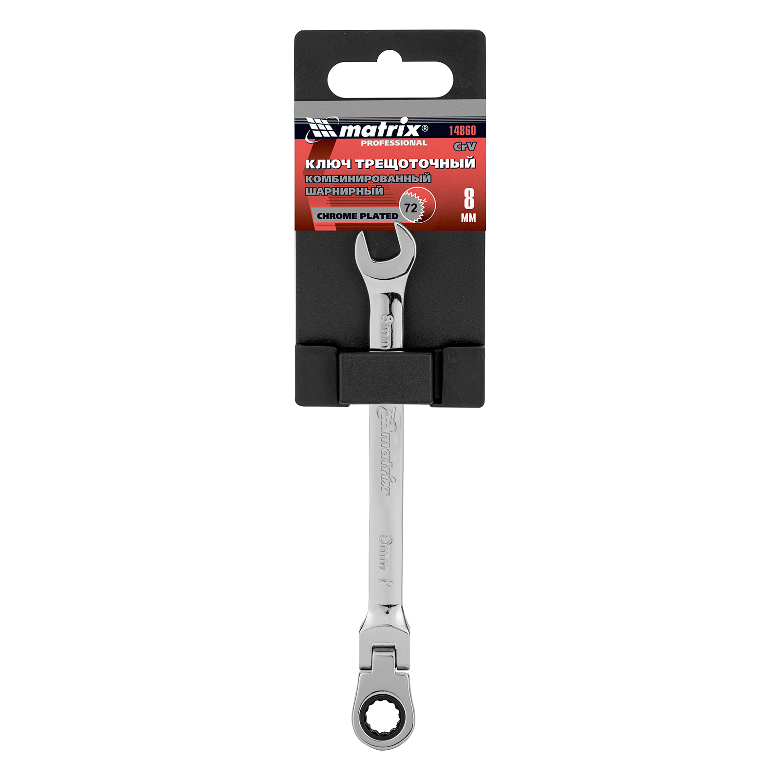 Ключ комбинированный трещоточный, 8 мм, CrV, шарнирный, зеркальный хром Matrix Professional в Уфе