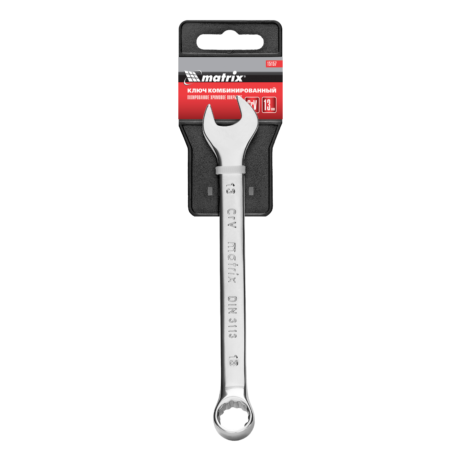 Комбинированный ключ Matrix 15157 размером 13 мм, из стали CrV, с покрытием «полированный хром», пригодится во время ремонтных работ дома или в гараже. С его помощью можно быстро монтировать и демонтировать крепежные элементы. Угол наклона кольцевого зева относительно плоскости инструмента составляет 15°, поэтому ключом удобно работать в труднодоступных местах.