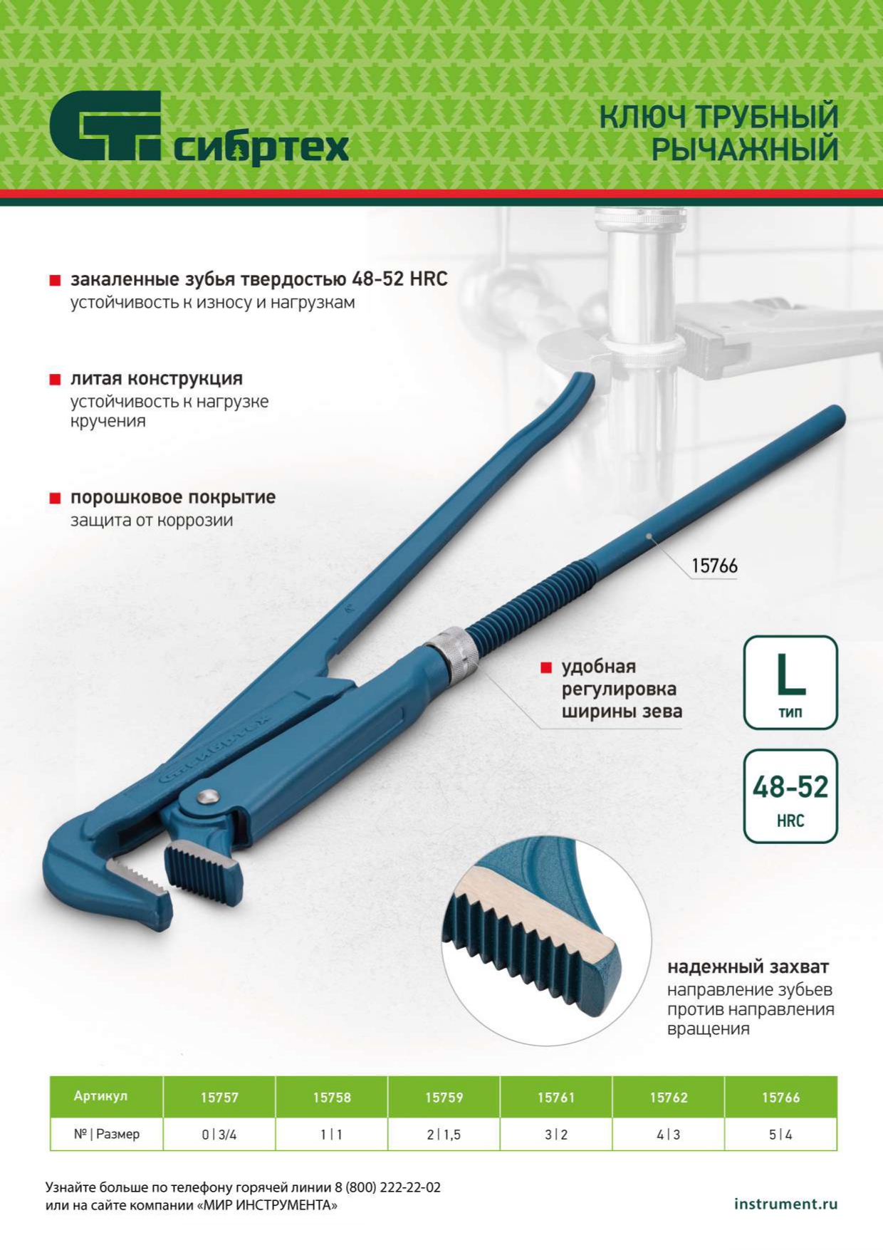 Литой трубный рычажный ключ Сибртех №5 15766, тип «L», используется для захвата и вращения труб диаметром 4", а также других деталей со специальным профилем и без него. Рычажный механизм увеличивает рабочее усилие, снижая нагрузку на руки мастера. Инструмент рассчитан на бытовое и профессиональное применение.