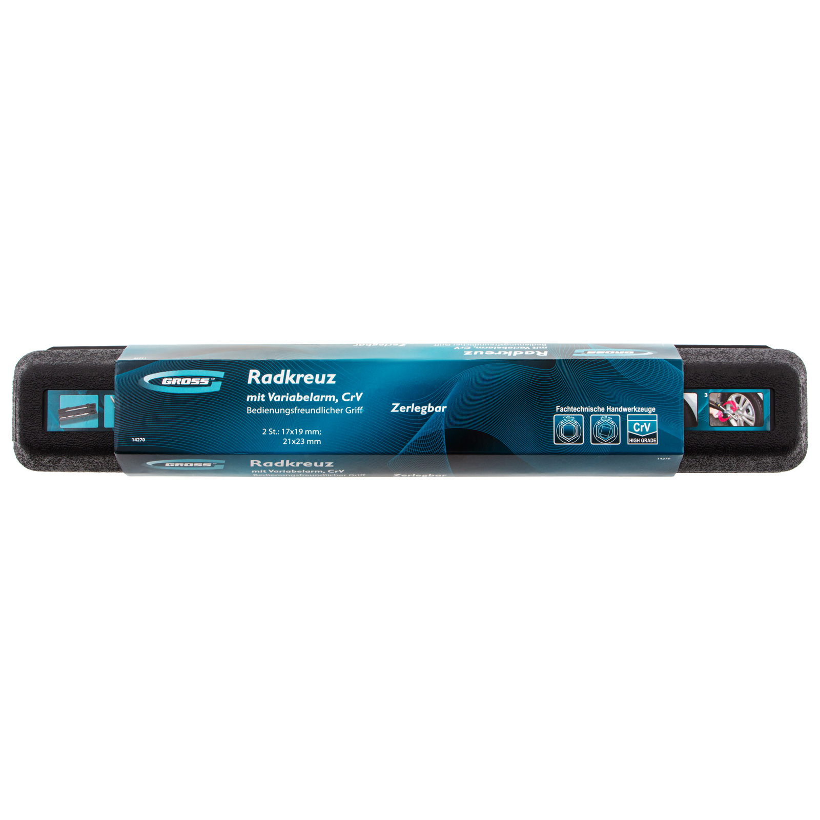Складной баллонный ключ-крест с изменяющимся рычагом Gross 14270 из стали CrV, хромированный, с головками на 17, 19, 21, 23 мм, предназначен для откручивания и закручивания колесных крепежей. Поставляется с двумя двусторонними торцевыми головками под 4 размера резьбовых соединений. Запатентованный механизм фиксации телескопической рукоятки позволяет изменять длину рычага и оптимально дозировать величину крутящего момента. Инструмент рекомендован для профессионального использования, также может применяться для самостоятельного обслуживания автомобиля.