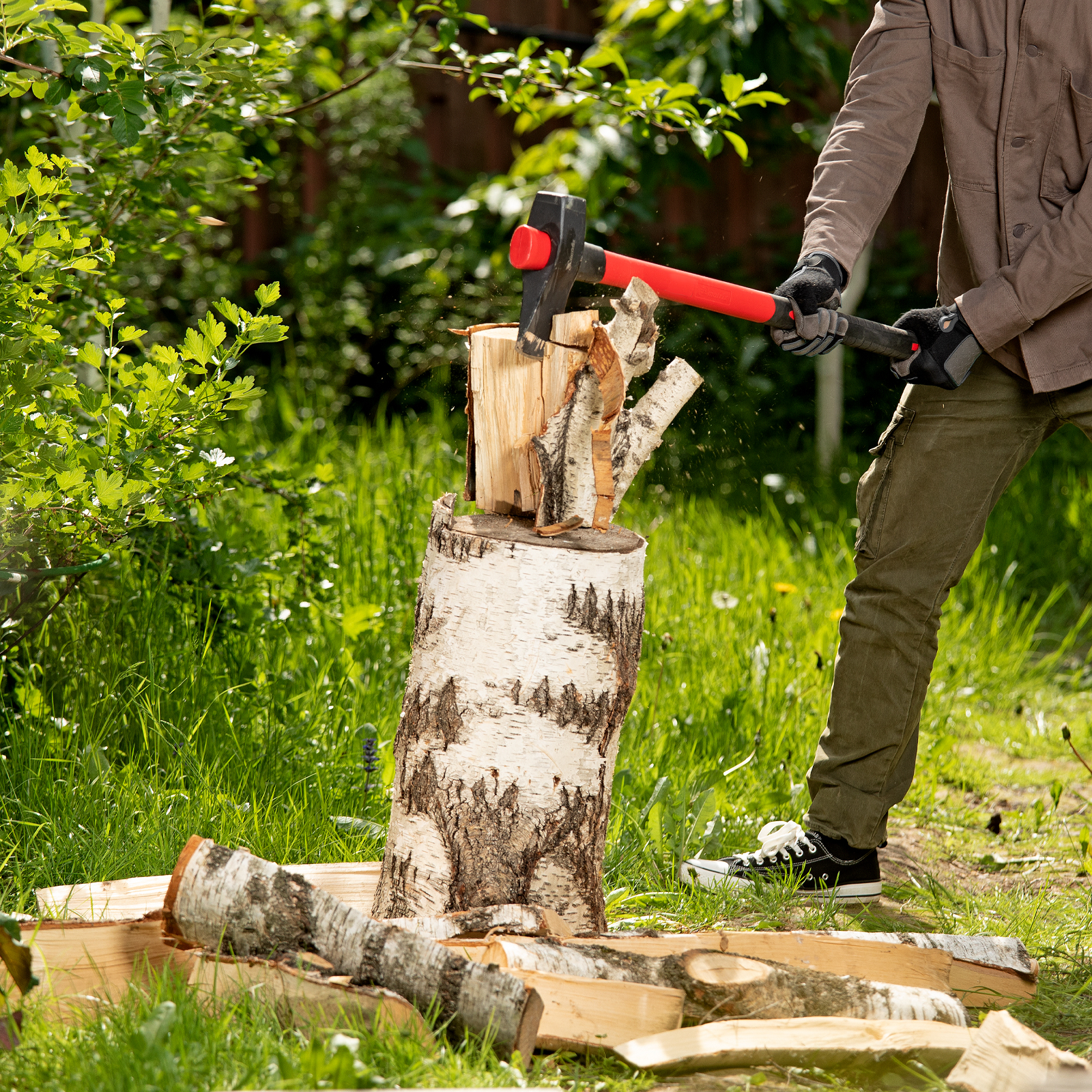 - Большая сила удара — колун оснащен длинной рукояткой 900 мм, полотно весит 2,7 кг.
