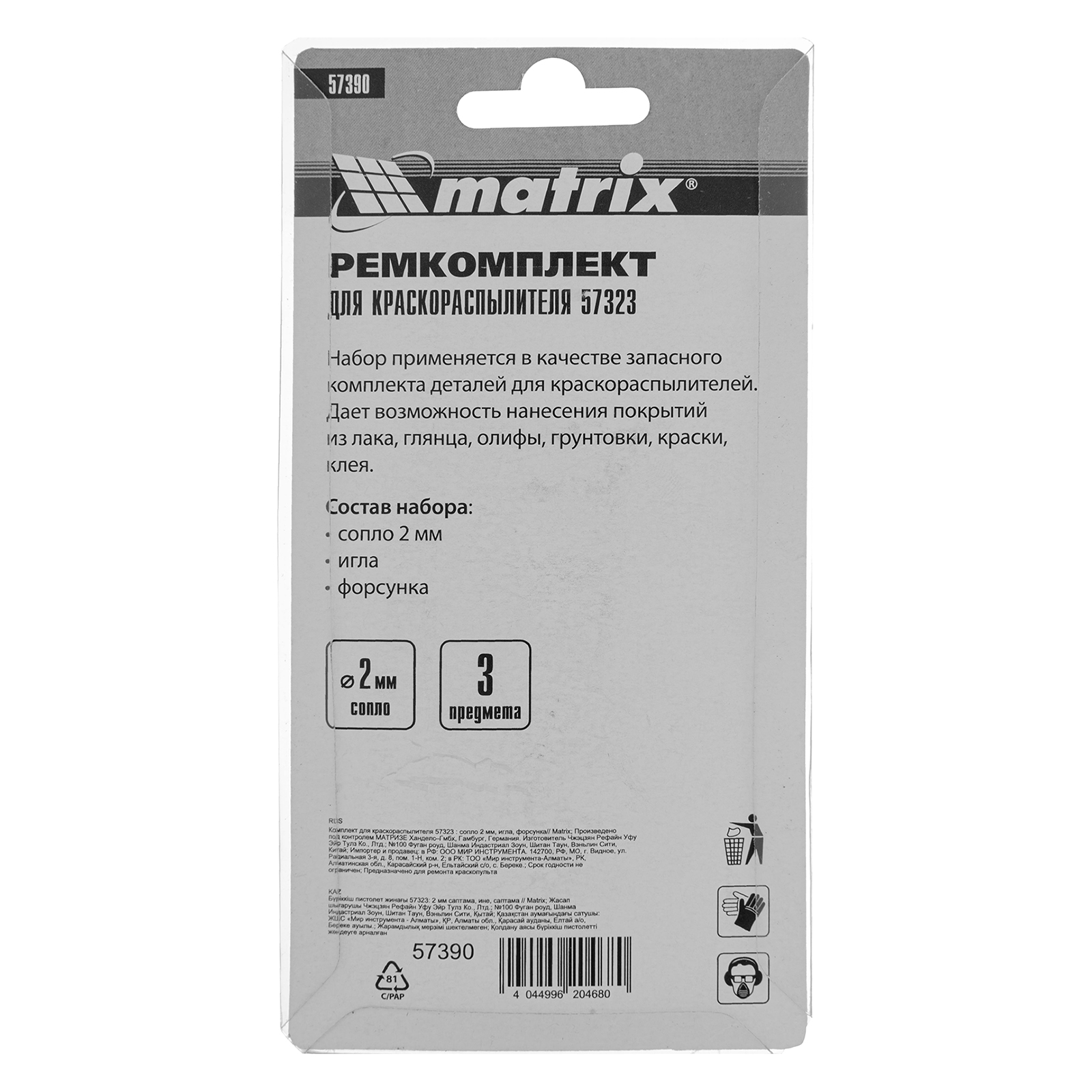 Комплект Matrix 57390 предназначен для краскораспылителя Matrix 57323 и включает в себя 3 предмета: сопло диаметром 2 мм, иглу и форсунку. Их можно использовать для ремонта инструмента или расширения его функциональных возможностей.