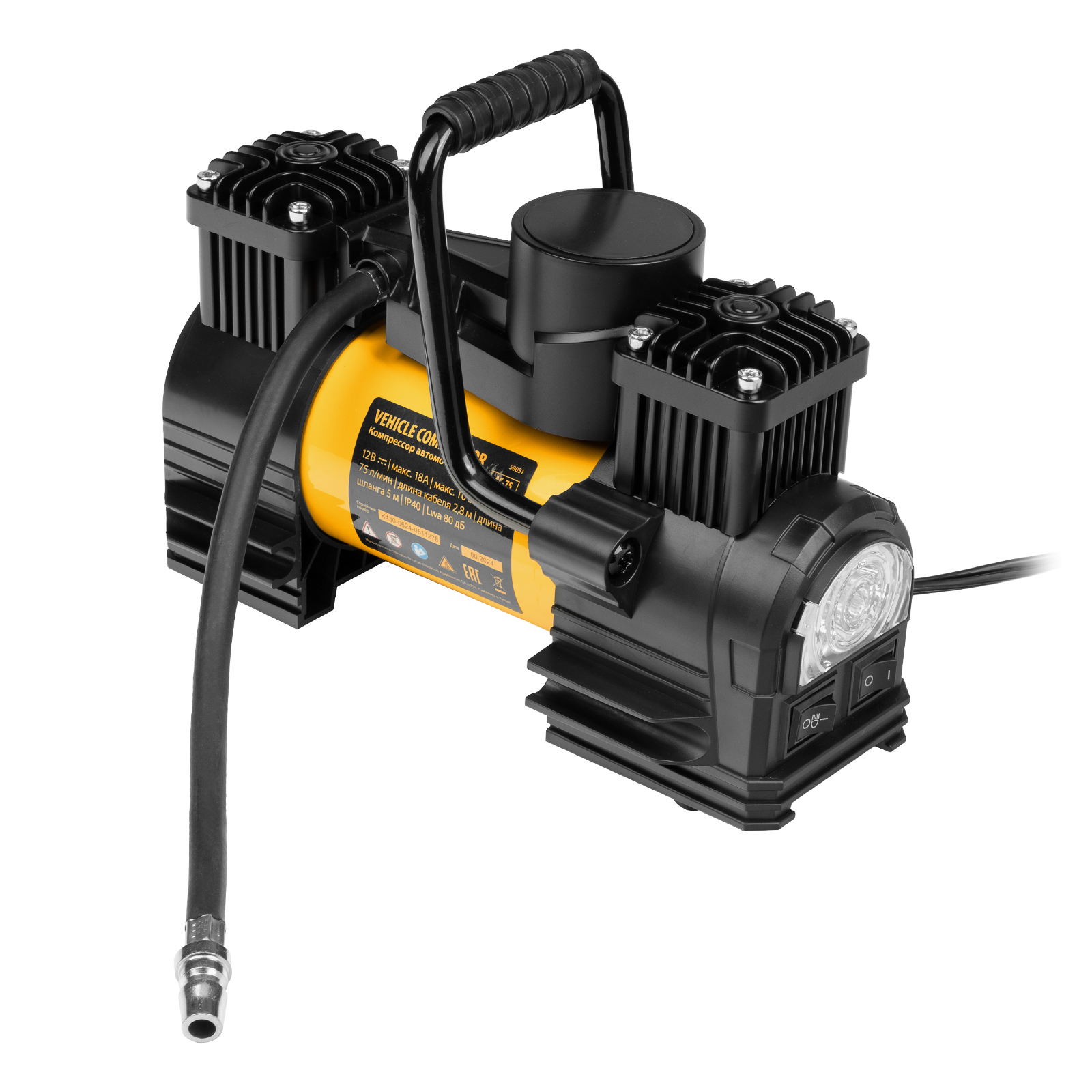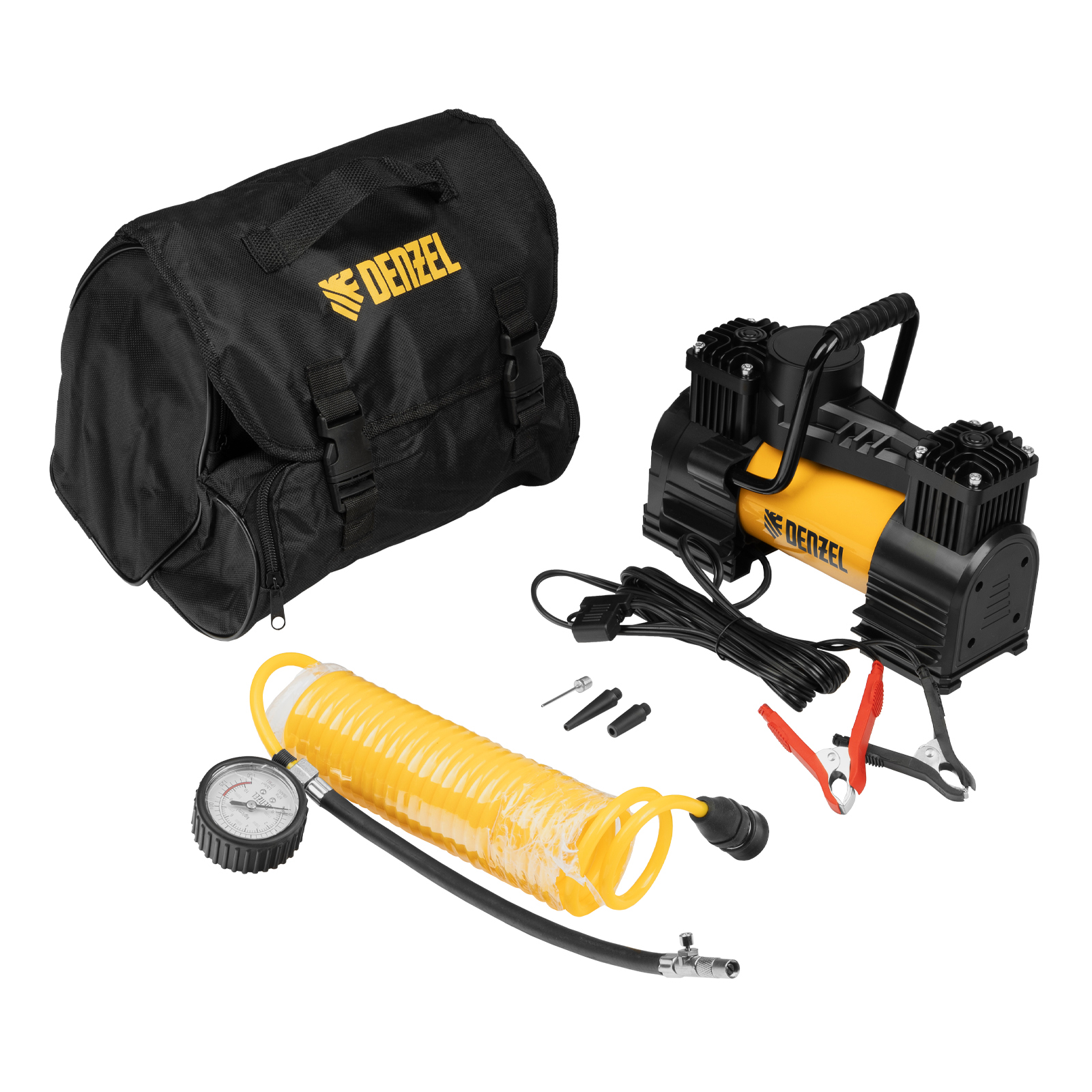 Автомобильный двухпоршневой компрессор Denzel AC-75 58051 производительностью 75 л/мин, с LED-фонарем, работает от сети 12 В, поддерживает давление 10 атм. и предназначен для быстрой и эффективной накачки шин, резиновых матрацев и других надувных предметов. Для этого в комплект поставки входит 3 насадки. Компрессор подключается к автомобильному аккумулятору при помощи клемм. Благодаря двухпоршневой конструкции отличается высокой производительностью — накачка шины R16 занимает не более 3-4 минут. Станет незаменимым помощником в поездке и на отдыхе.