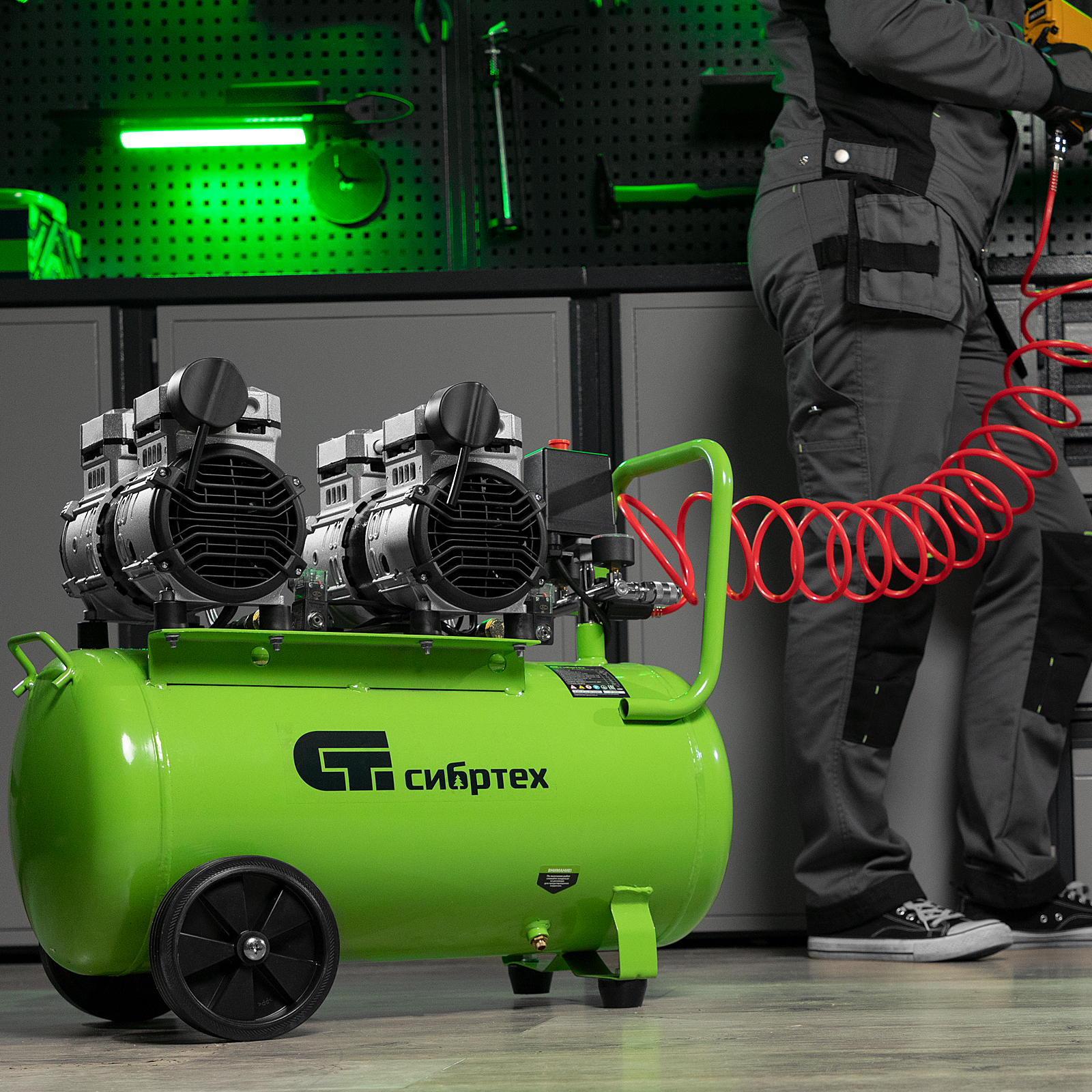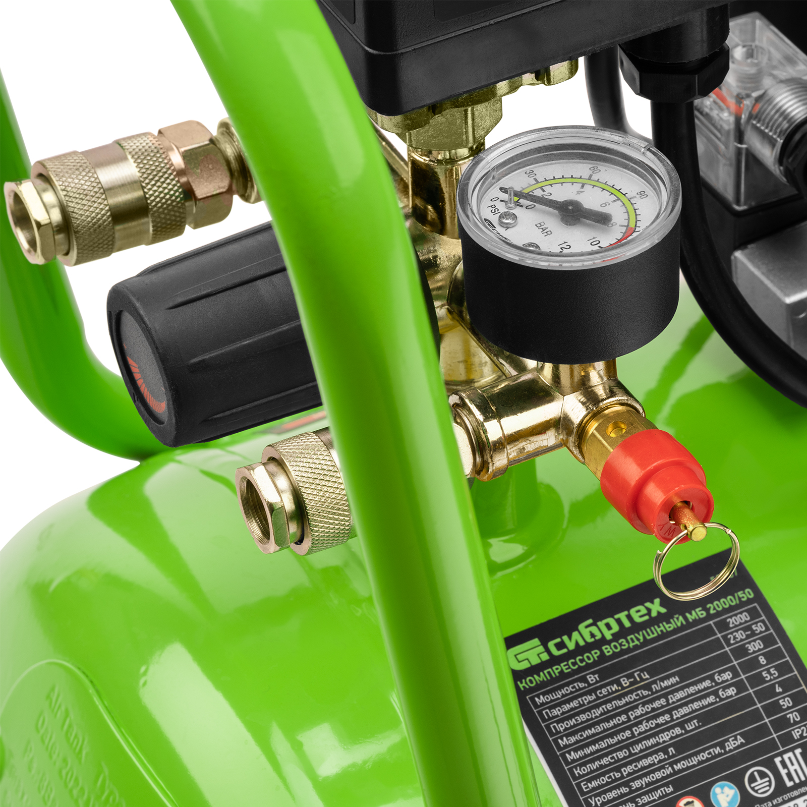 - Контроль рабочих параметров — компрессор оборудован механическим манометром для отслеживания давления.
