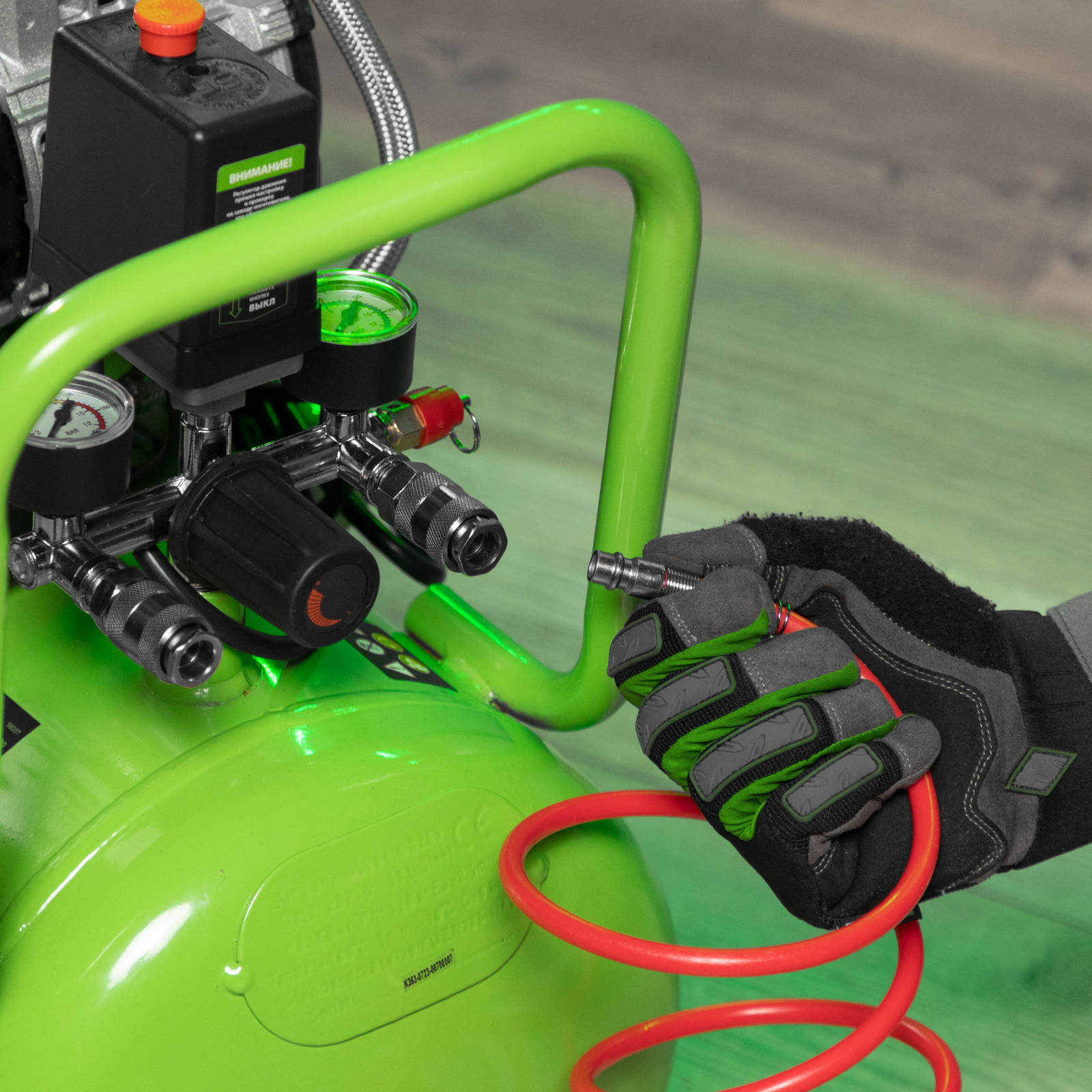 - Простое подключение — выходной быстросъемный коннектор позволяет подсоединить пневмоинструмент одним движением.