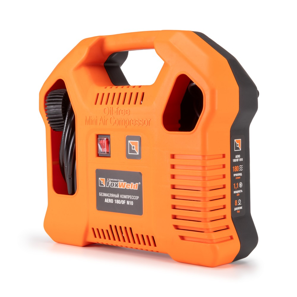 Портативный безмасляный компрессор AERO 180/0F N10 специально разработан для производства сжатого воздуха без примесей масла и совместного использования с пневматическими инструментами (аэрографы, краскораспылители, продувочные пистолеты), а также с иным пневмоинструментом, подходящим по давлению и расходу воздуха. AERO 180/0F N10 также подойдёт для накачивания шин, надувных матрасов и плавательных принадлежностей. Удобен при продувке электрооборудования, узлов и агрегатов. В корпусе предусмотрены специальные отсеки для хранения кабеля питания, пневмопистолета, шланга и аксессуаров.МОБИЛЬНОСТЬ: Компактный продуманный дизайн и удобная транспортировочная ручка позволяют легко переносить компрессор с одного места на другое. Небольшие габариты и вес делают несложным размещение оборудования на любой рабочей площадке и упрощают хранение.ЭРГОНОМИЧНОСТЬ: В корпусе предусмотрены отсеки для хранения кабеля питания, пневмопистолета, шланга и аксессуаров. Такое решение позволяет аккуратно расположить части компрессора и его комплектующие в одном месте и с удобством переносить оборудование.РАСШИРЕННАЯ КОМПЛЕКТАЦИЯ: К компрессору прилагается пистолет для накачивания с манометром, набор сопел и переходников. Комплект пневмоинструментов хранится внутри корпуса.ЗАЩИТА ОТ ПЕРЕГРЕВА: Встроенное реле от перегрева защищает двигатель и другие компоненты компрессора от чрезмерного износа и повреждения. В случае превышения максимальной допустимой рабочей температуры срабатывает реле и двигатель автоматически отключается.НЕБОЛЬШОЙ ВЕС: Портативное исполнение – компрессор отличается небольшими размерами и весит около 6 кг, его легко перемещать с точки на точку, он удобен в транспортировке.ПРЕИМУЩЕСТВА:Антивибрационные опорыБыстросъёмное соединение RapidПростота в использованииВысокая мощностьВысокая производительностьНизкий уровень шумаУдобная ручка для транспортировкиРасширенная комплектацияКОМПЛЕКТАЦИЯ: Компрессор безмасляный AERO 180/0F N10 – 1 шт.; Пистолет для накачки шин с манометром – 1 шт.; Адаптер – 1 шт.; Набор сопел и наконечников (8 шт.) – 1 компл.; Инструкция + Гарантийный талон – 1 компл.*Производитель оставляет за собой право менять комплектацию оборудования.