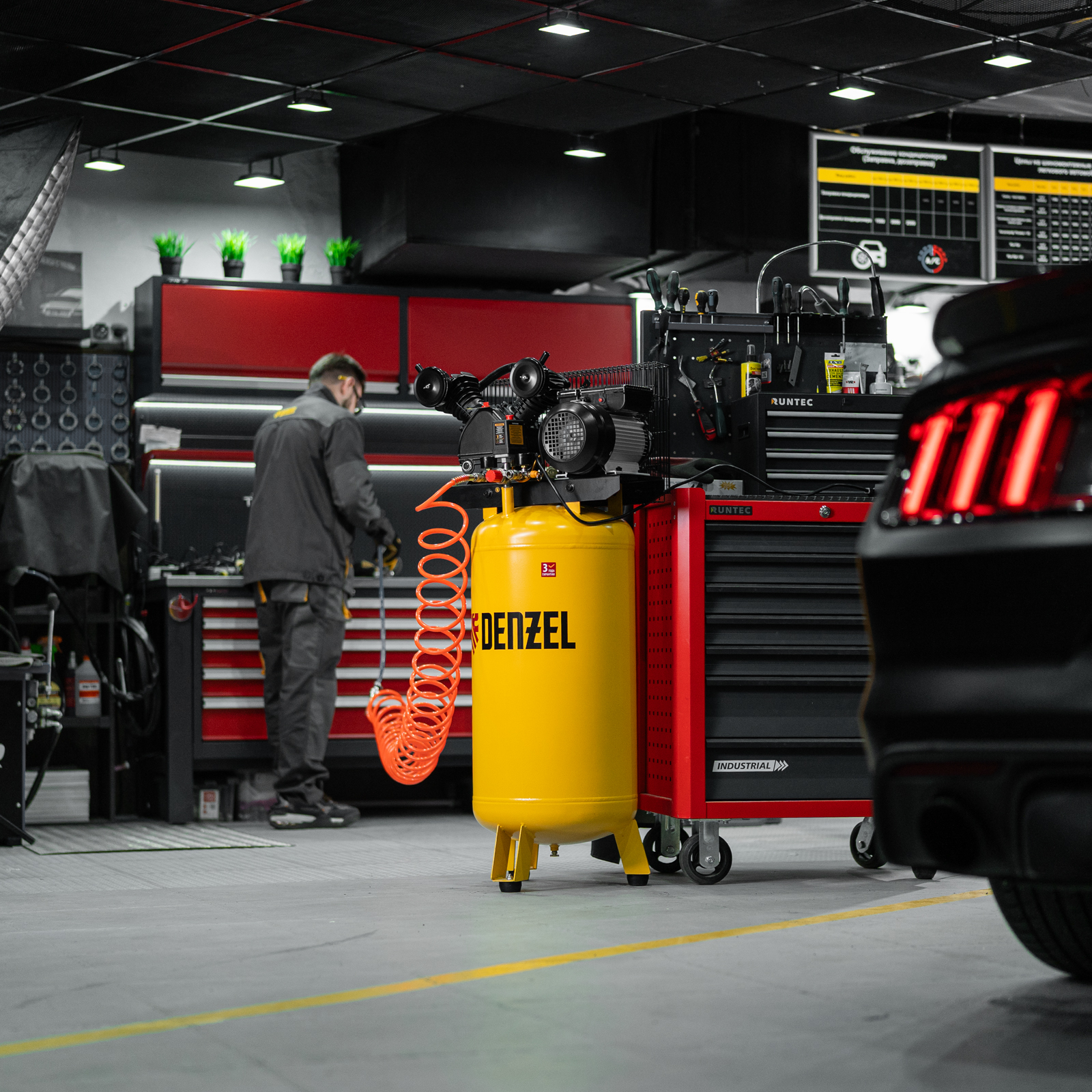 Компрессор воздушный с ременным приводом Denzel BCV2200/100V 58112 мощностью 2,3 кВт, с ресивером объемом 100 л используется для обеспечения сжатым воздухом таких инструментов, как краскораспылитель, гайковерт, гвоздезабивной пистолет, дрель, пистолет для накачки шин и пр. Высокая производительность 440 л/мин позволяет использовать его не только в загородных домах и гаражах, но и на фабриках, станциях технического обслуживания автомобилей, в различных мастерских.,Сжатый воздух накапливается в ресивере объемом 100 литров. Он располагается вертикально, что позволяет сэкономить место на рабочей площадке. Для устойчивости компрессор крепится к стене или полу.