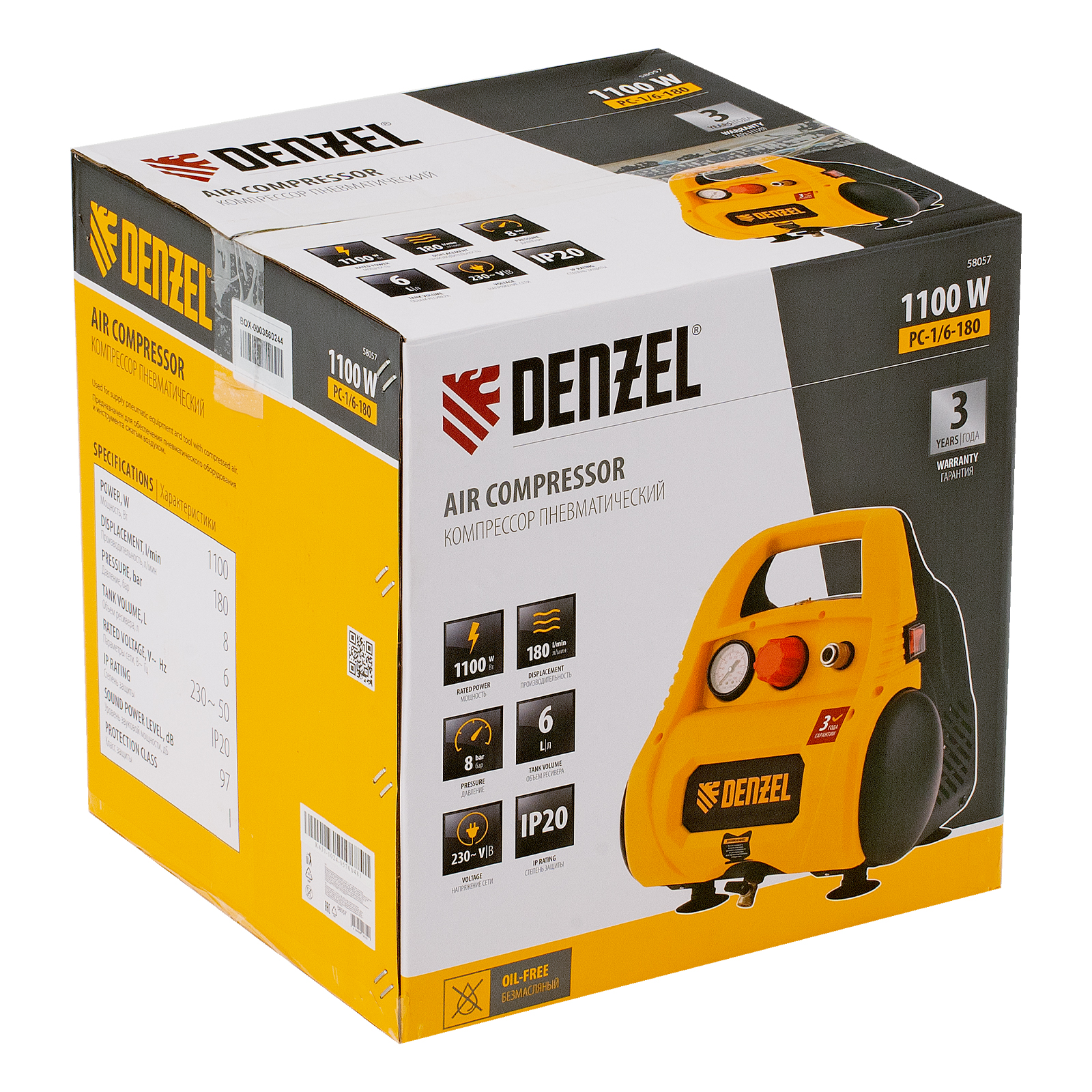 Компрессор воздушный безмасляный РС 1/6-180,1, 1 кВт, 180 л/мин, 6 л Denzel в Уфе