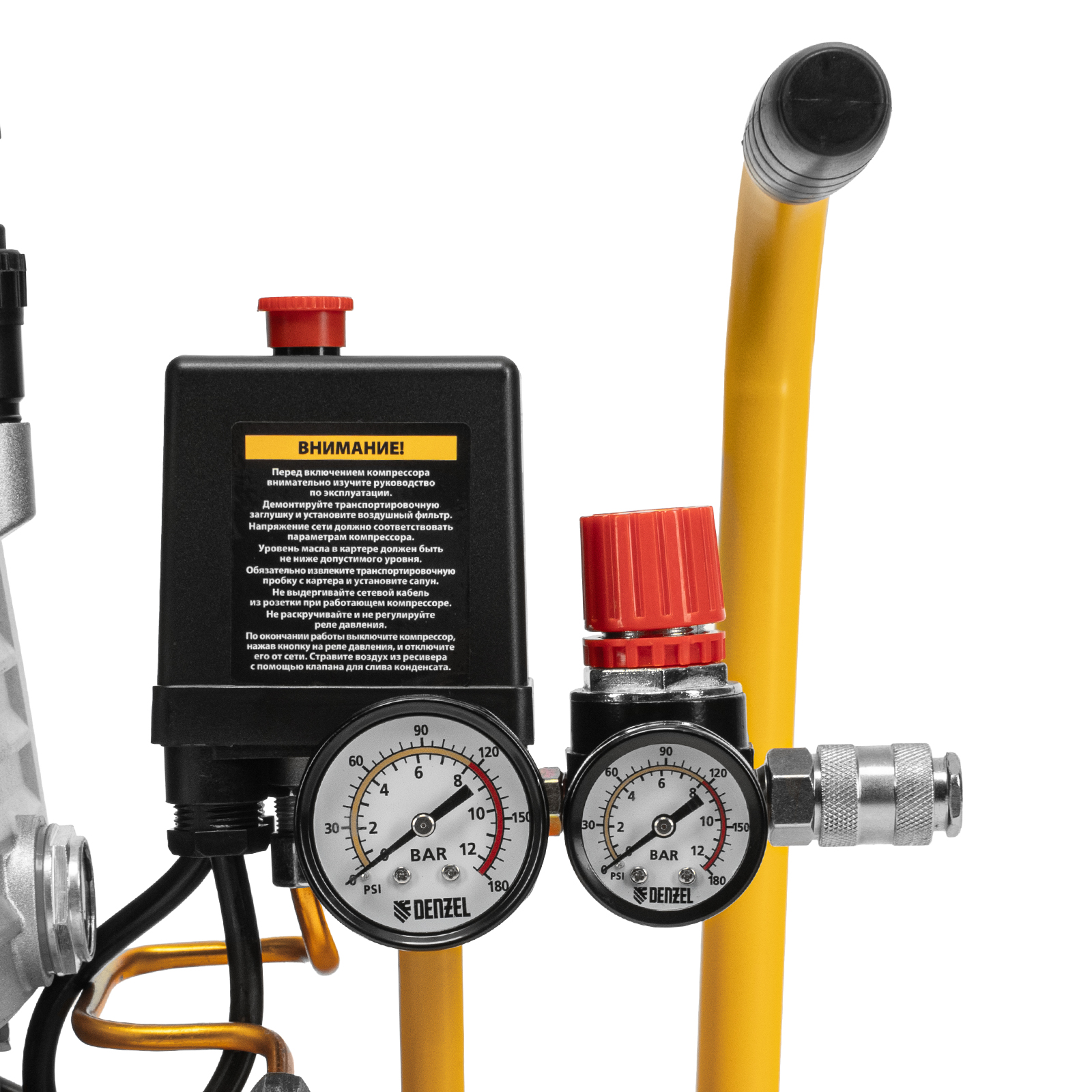 - Контроль рабочих параметров — давление в ресивере и выходной магистрали легко отслеживать благодаря 2 манометрам.