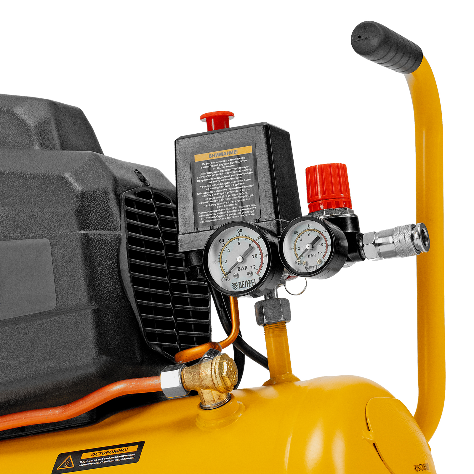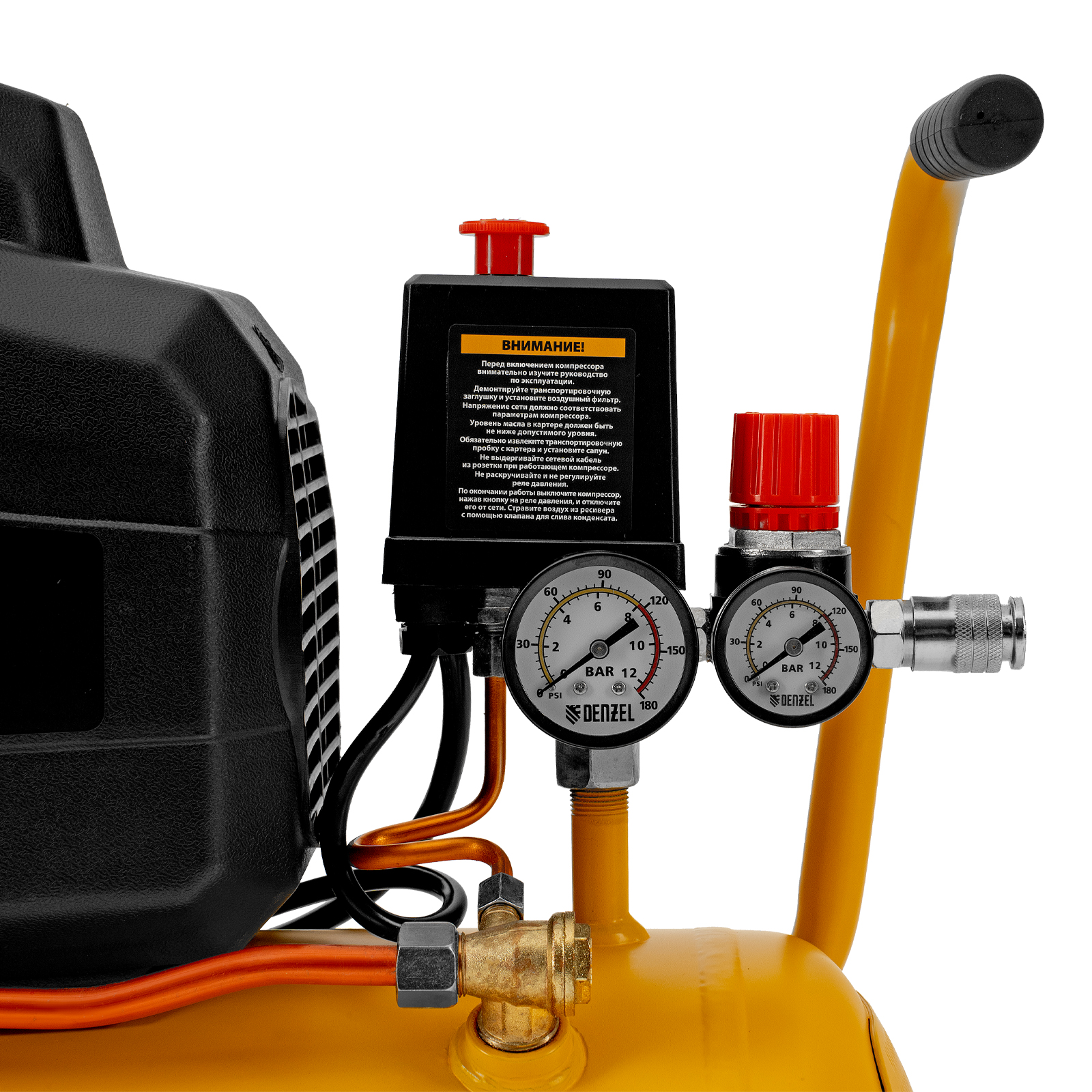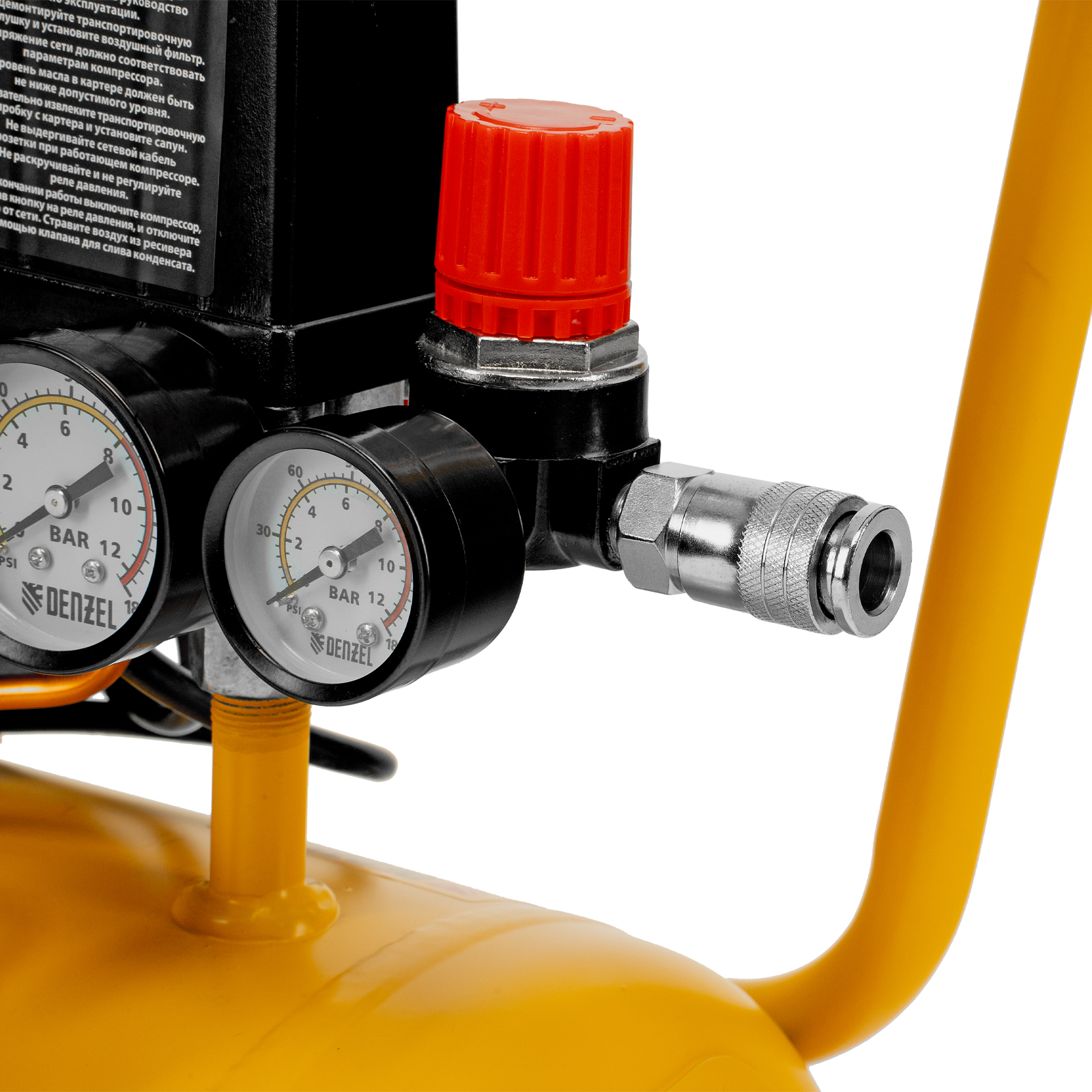 - Удобный контроль рабочих параметров — 2 манометра отображают давление в ресивере и выходной магистрали.