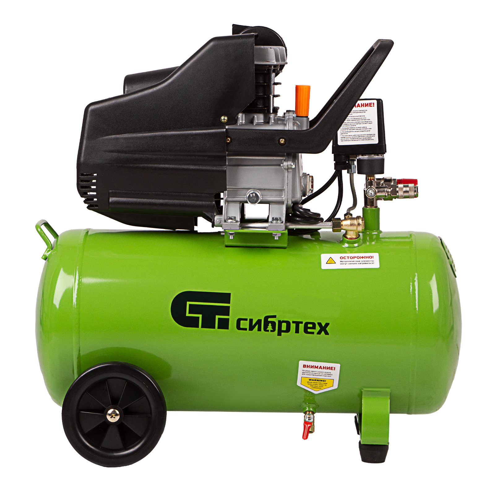 - Простота перемещения — поворотные колеса и удобная рукоятка помогают без усилий развернуть или переставить компрессор.