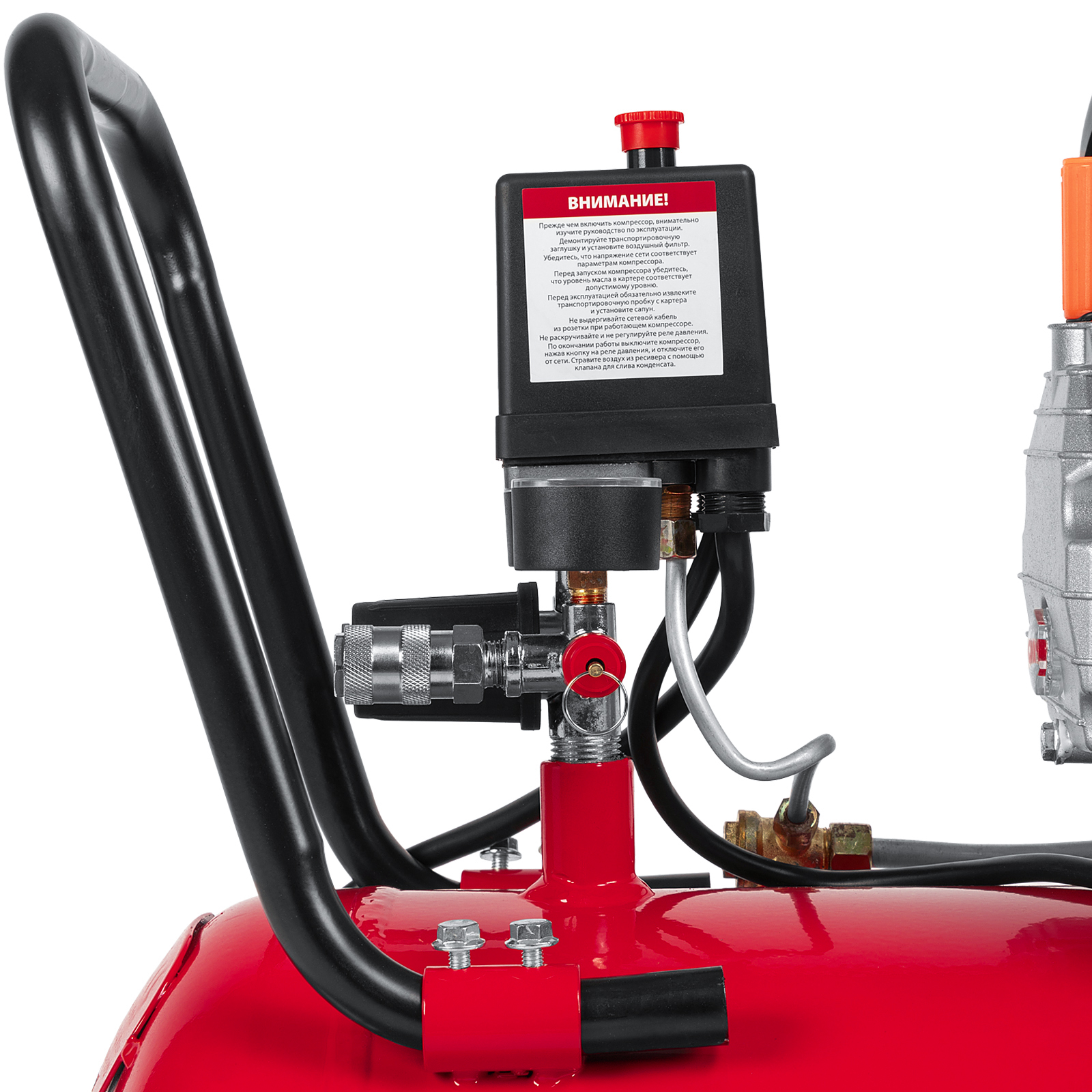 - Автономная работа — прессостат обеспечивает автоматическую остановку двигателя по достижении максимального рабочего давления и запуск при падении давления до минимального уровня.