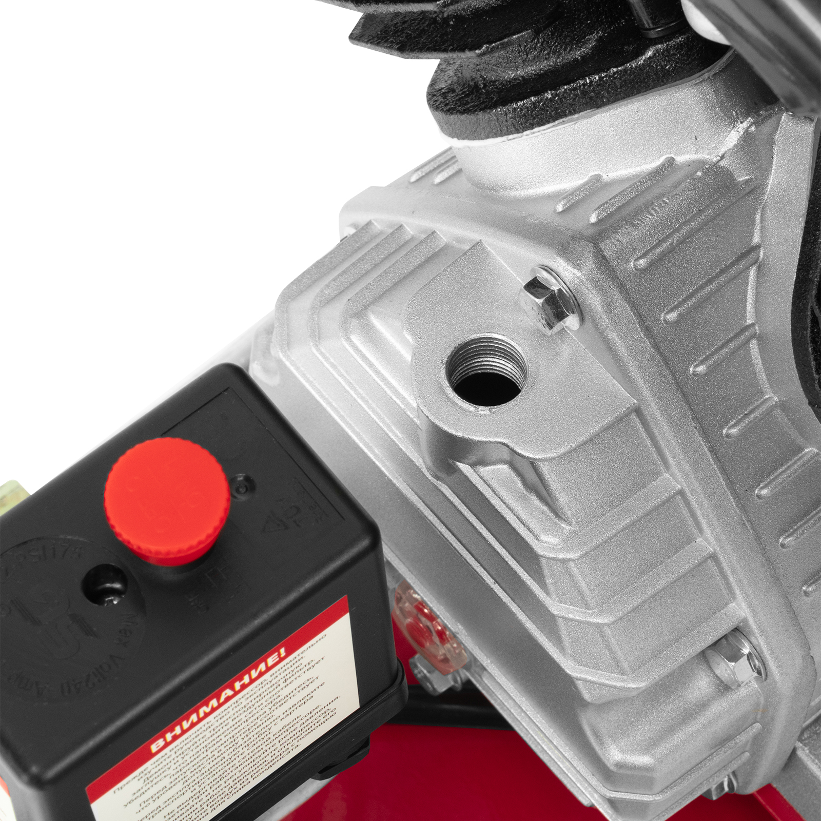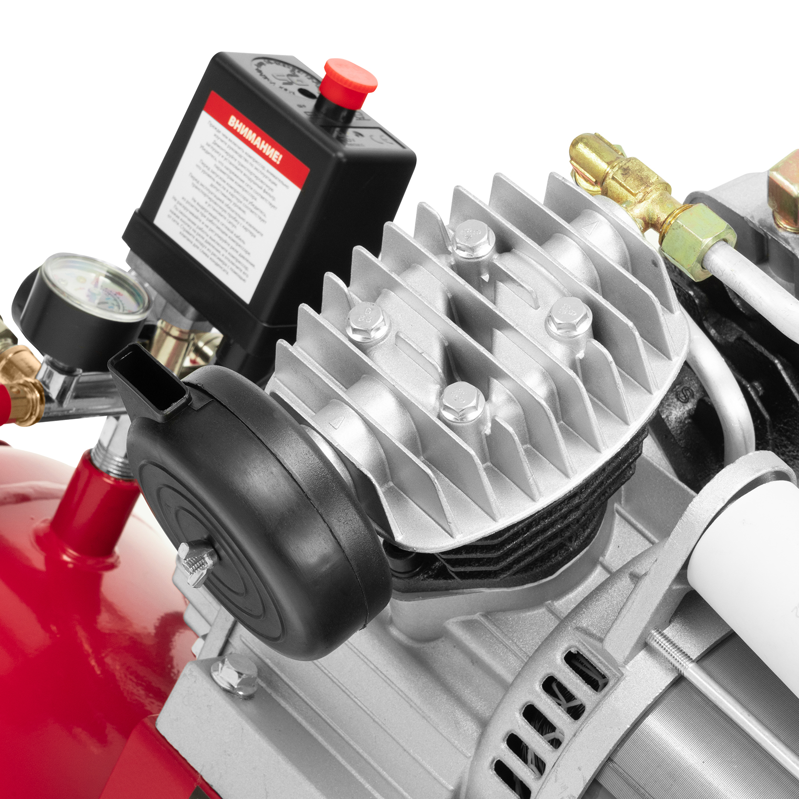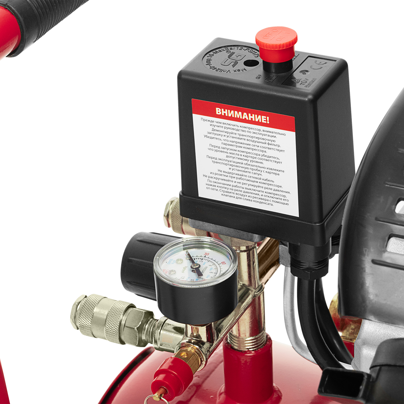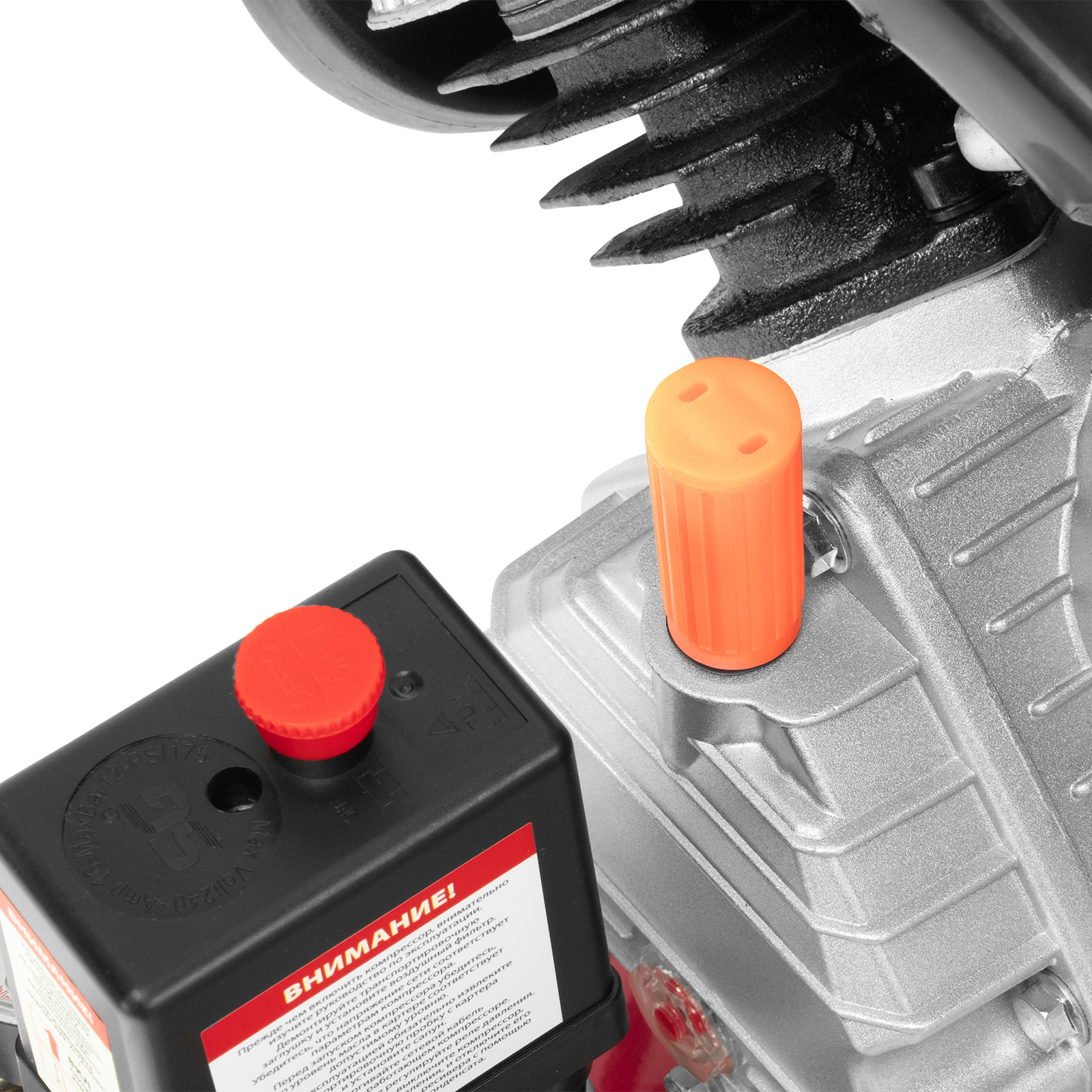 - Автономная работа — прессостат обеспечивает автоматическую остановку двигателя по достижении максимального рабочего давления и запуск при падении давления до минимального уровня.