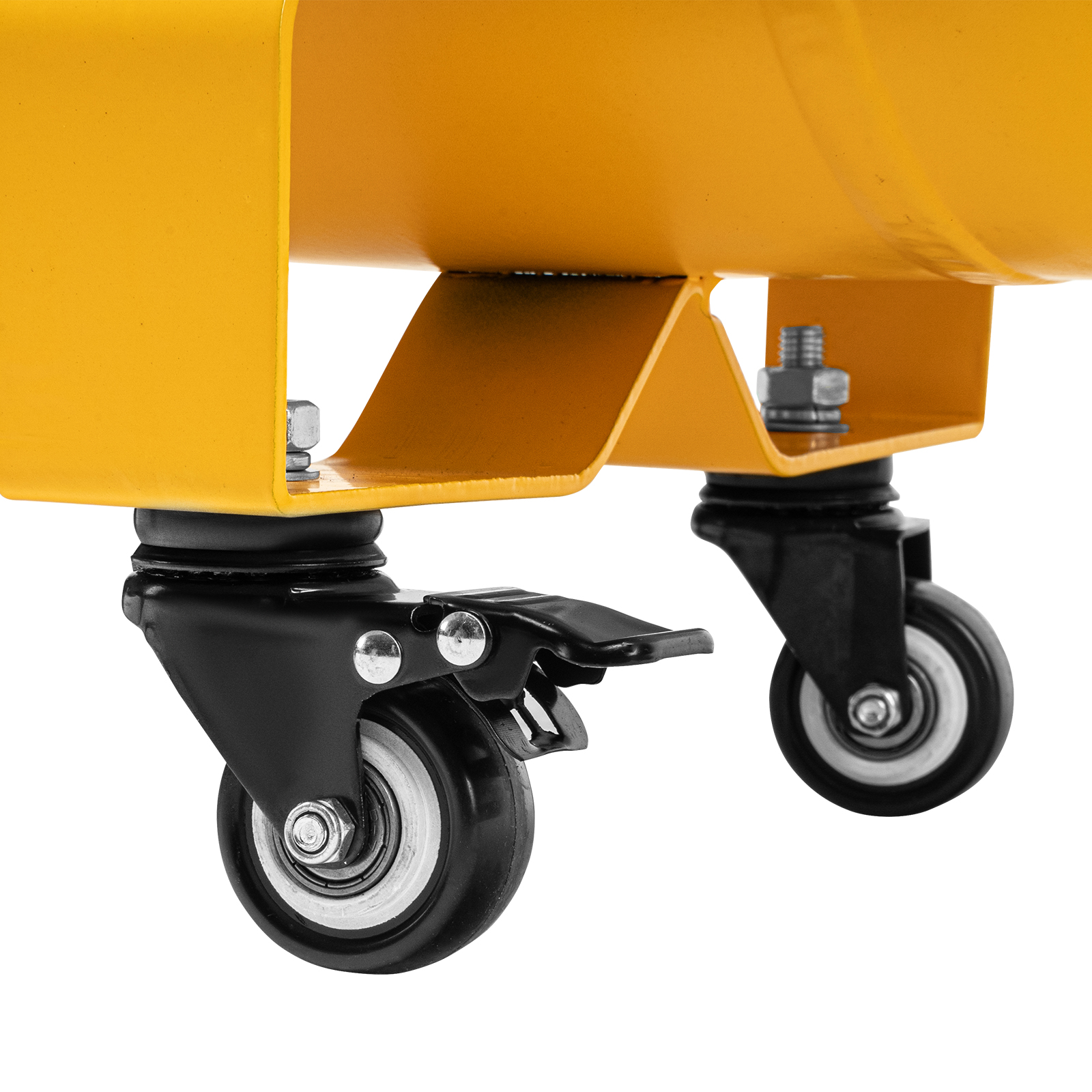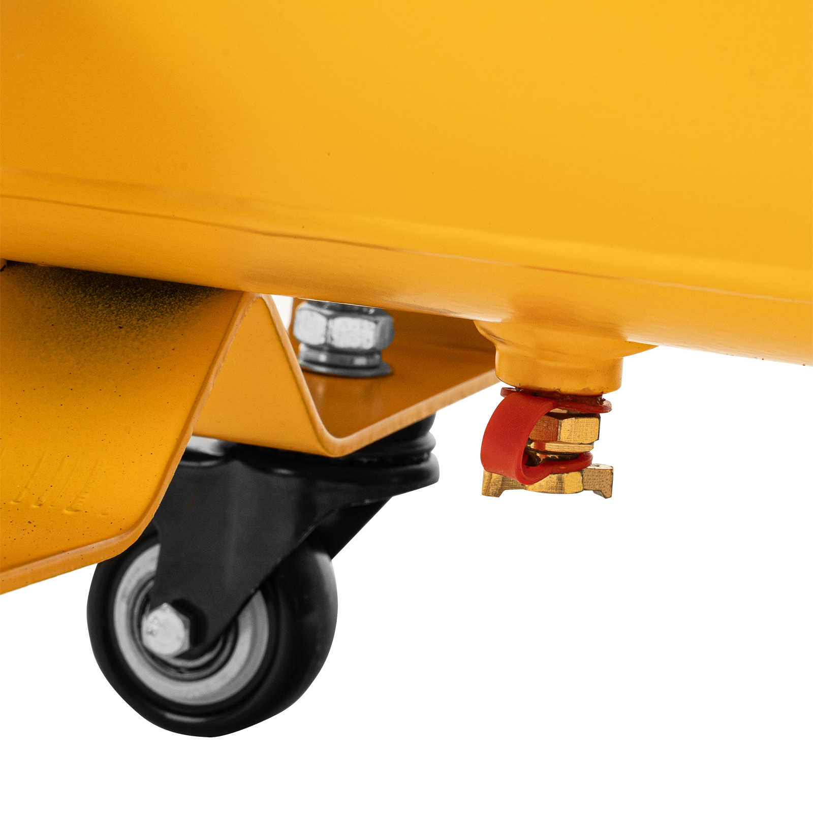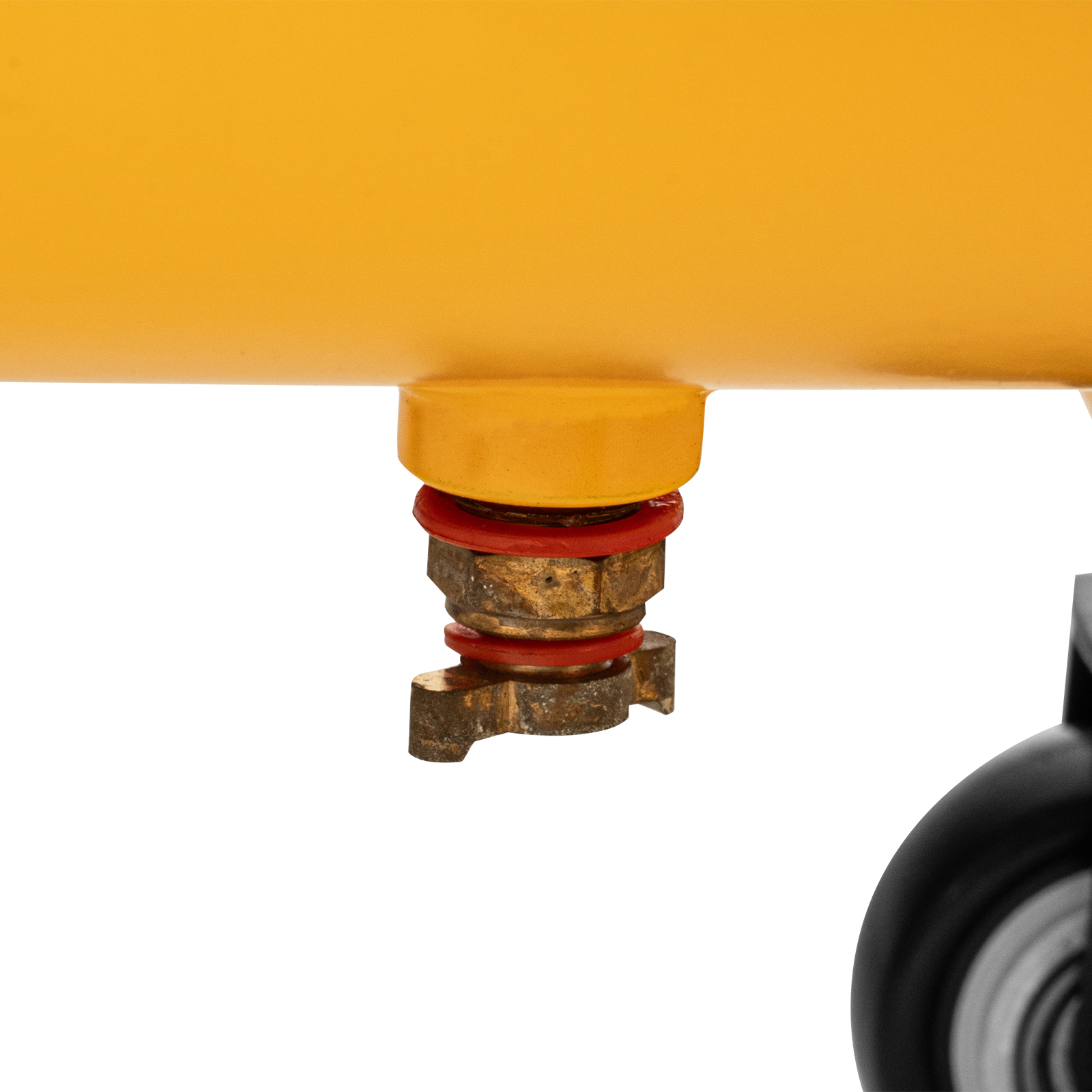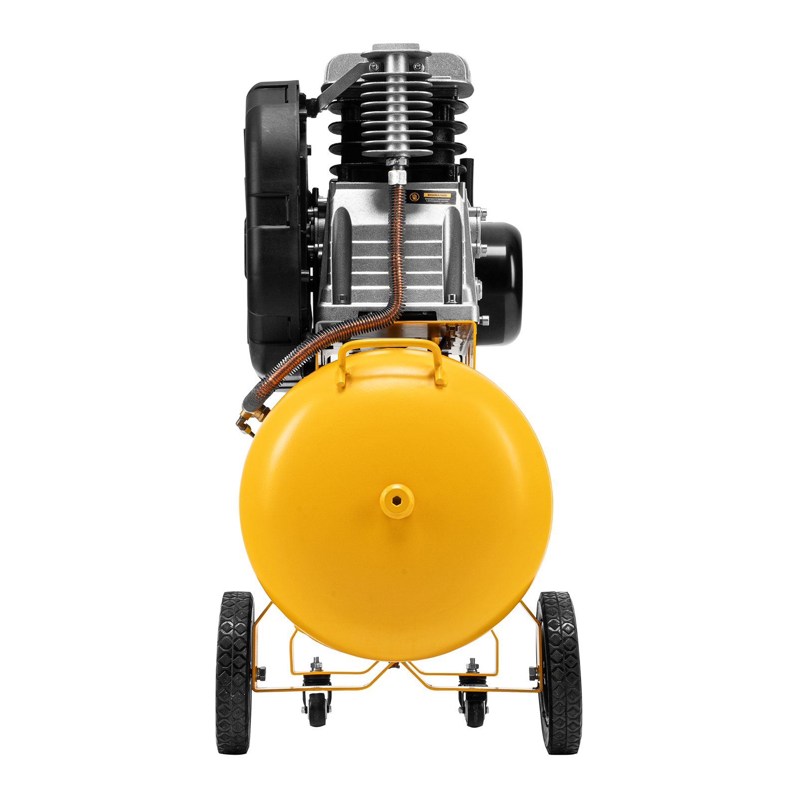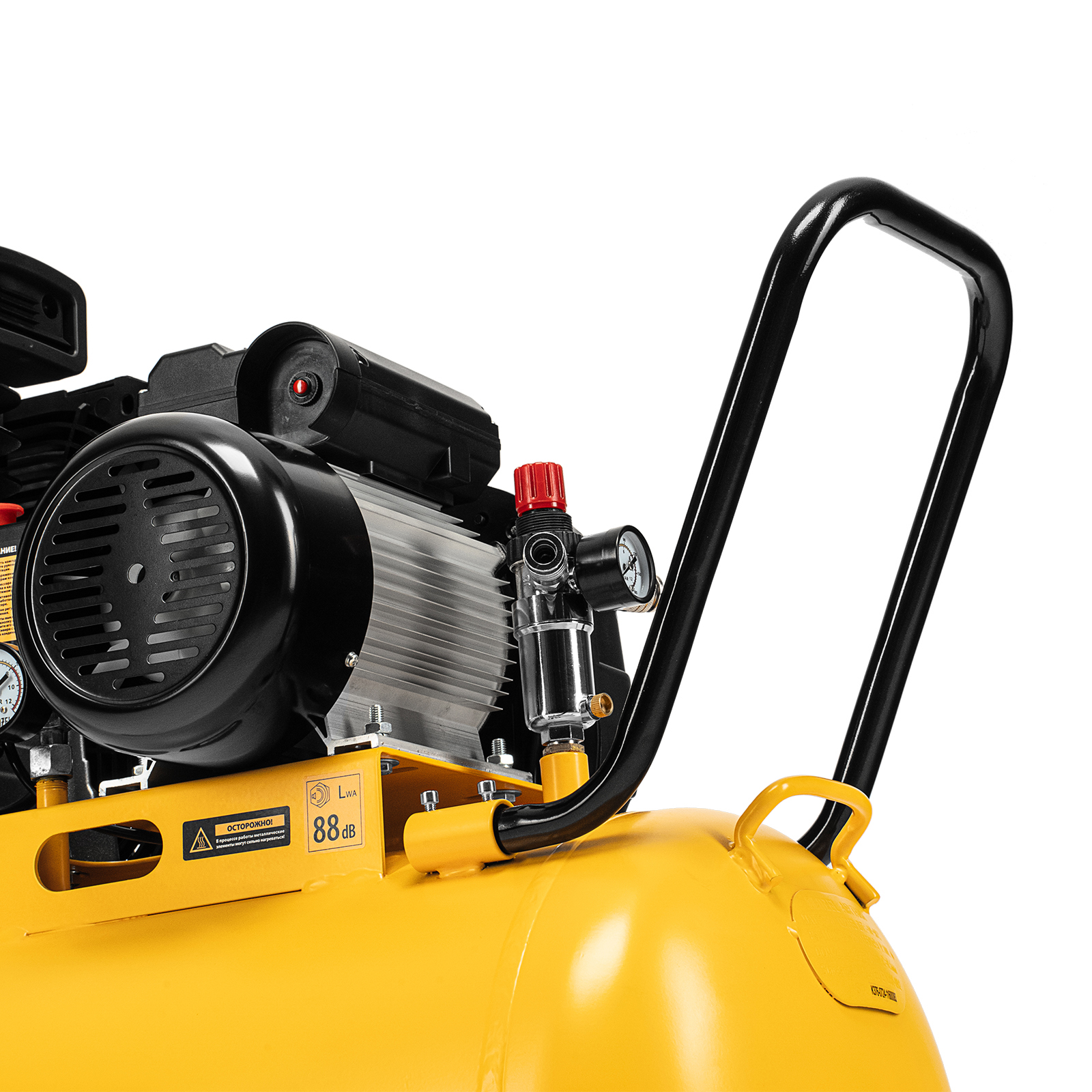 - Удобная транспортировка — на компрессоре установлены колеса, в т. ч. поворотные, и П-образная рукоятка.