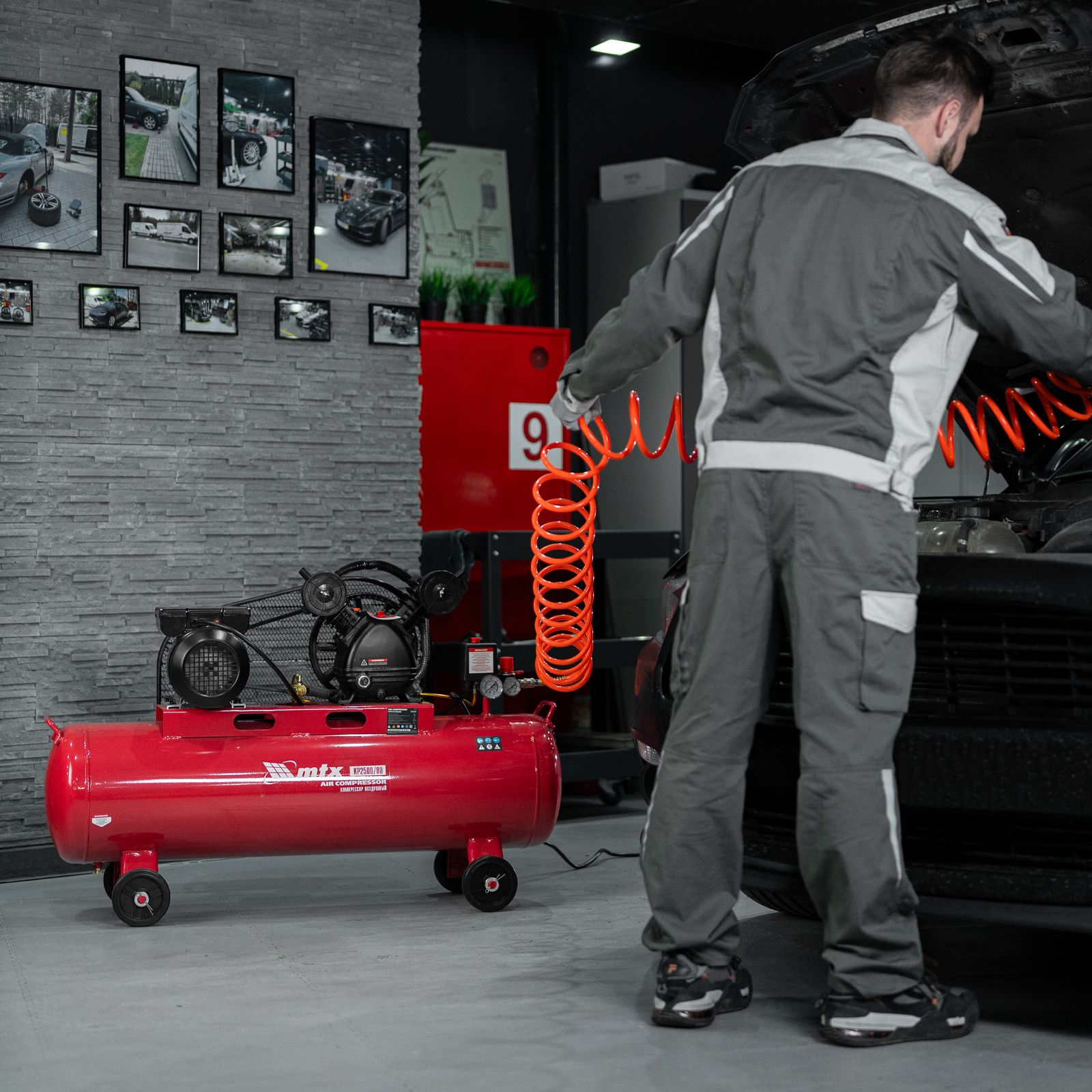 Компрессор воздушный МТХ КР2500/80 58022 с ременным приводом от электродвигателя, мощностью 2,5 кВт и производительностью 420 л/мин, с ресивером объемом 80 литров, применяется для подачи сжатого атмосферного воздуха к пневматическому инструменту. К нему можно подключить гайковерт, дрель, углошлифовальную машину, степлер, краскопульт, продувочный пистолет или другой пневмоинструмент. Для подключения предусмотрены 2 штуцера: быстросъемный и «елочка». Компрессор подходит для профессионального использования на предприятии автосервиса, строительной площадке, в мастерской.