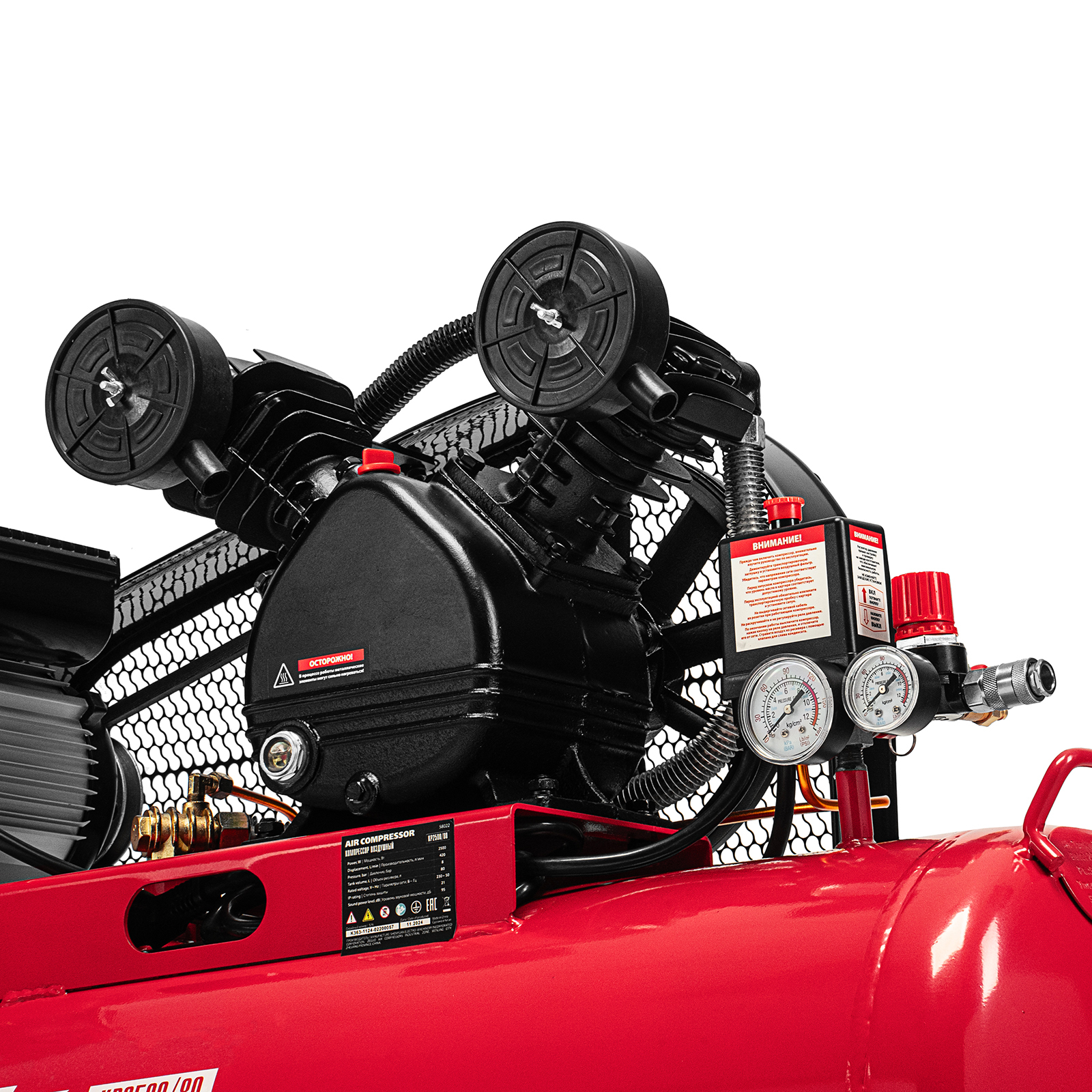 - Удобный контроль давления в ресивере и пневмомагистрали — компрессор оснащен двумя механическими манометрами.