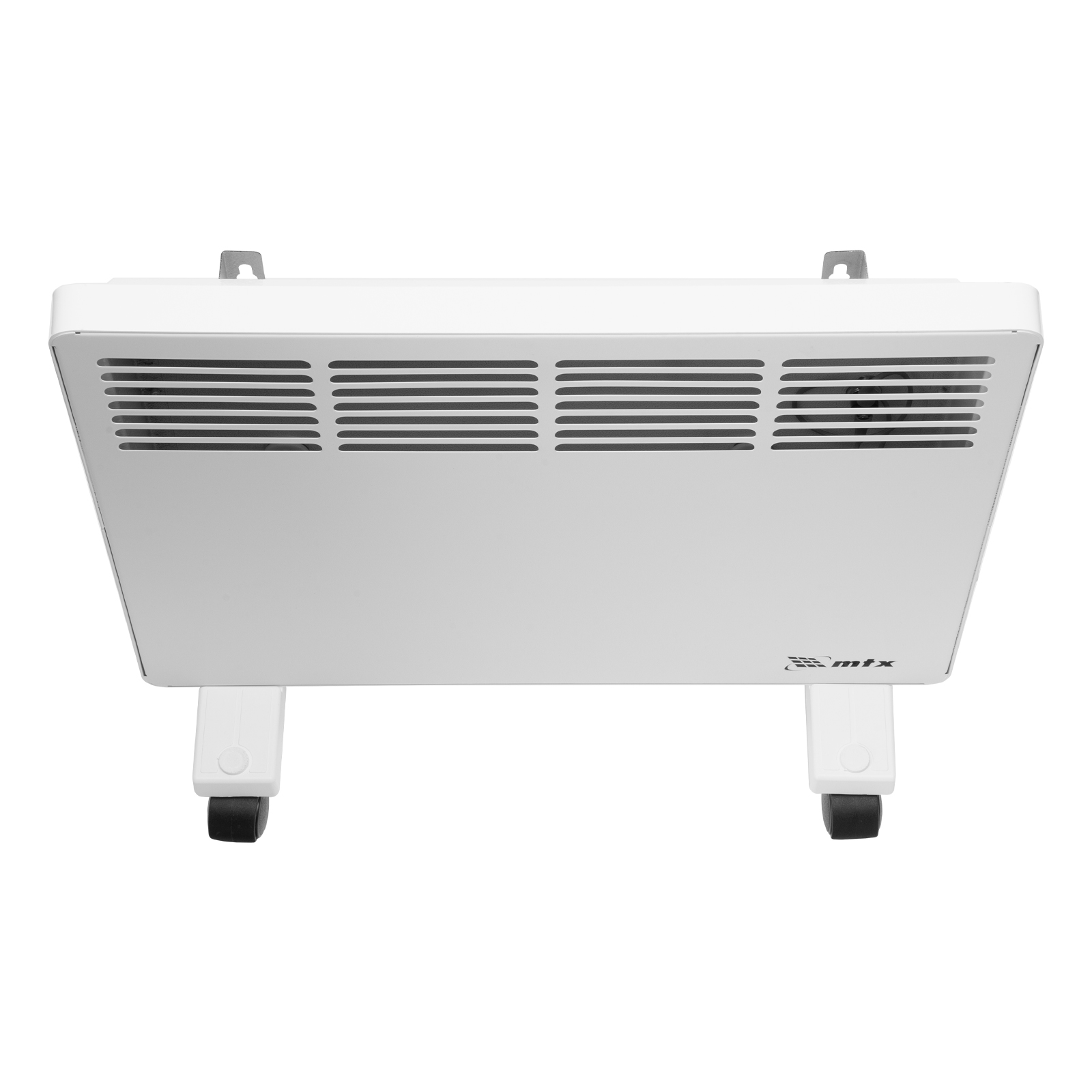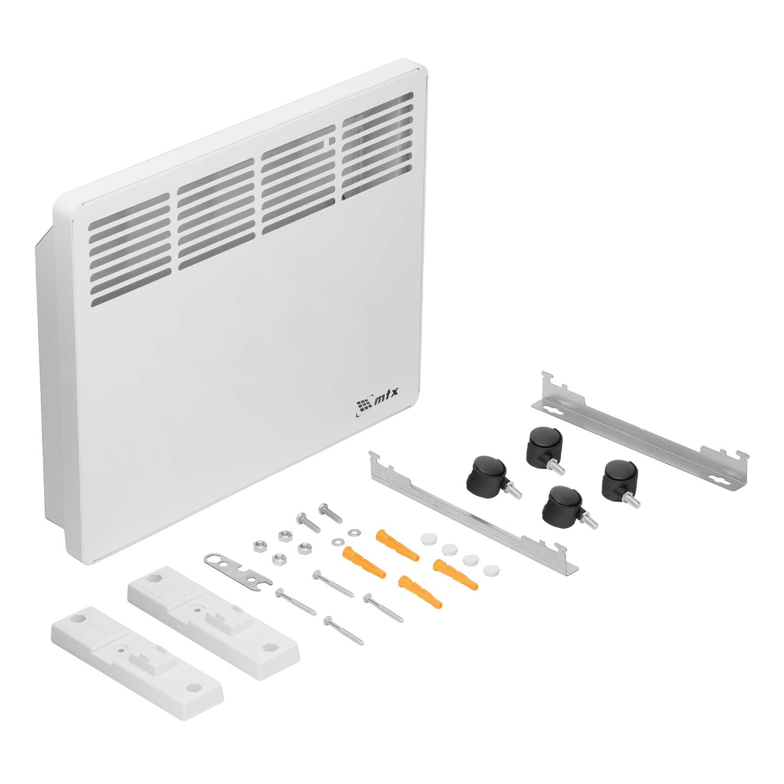 - Два варианта монтажа — конвектор можно расположить на полу или повесить на стену (колесные пары и кронштейн входят в комплект поставки).