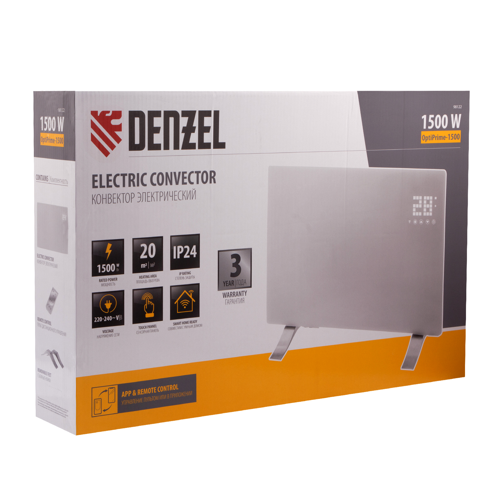 Электрический конвектор Denzel OptiPrime-1500 98122 максимальной мощностью 1500 Вт, с тачскрином, цифровым термостатом и функцией подключения к Wi-Fi, рассчитан на обогрев квартиры, дачи, загородного дома, офиса, а также пригодится в производственных, бытовых и общественных помещениях. Рекомендуемая площадь обогрева — 20 кв.м. Две мощности обогрева 750 и 1500 Вт позволяют поддерживать температуру в отапливаемой комнате и полностью прогревать холодные помещения.,Устройство оснащено Х-образным нагревательным элементом — самым долговечным среди аналогов, обеспечивающим максимально равномерный прогрев помещения. Конвектор не сушит воздух, не сжигает пыль и исключает появление неприятного запаха.