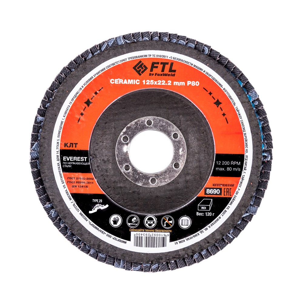 Круг лепестковый с керамическим абразивом для шлифования по нержавеющей стали FTL Everest 29 125 х 22,2 мм P80 в Уфе