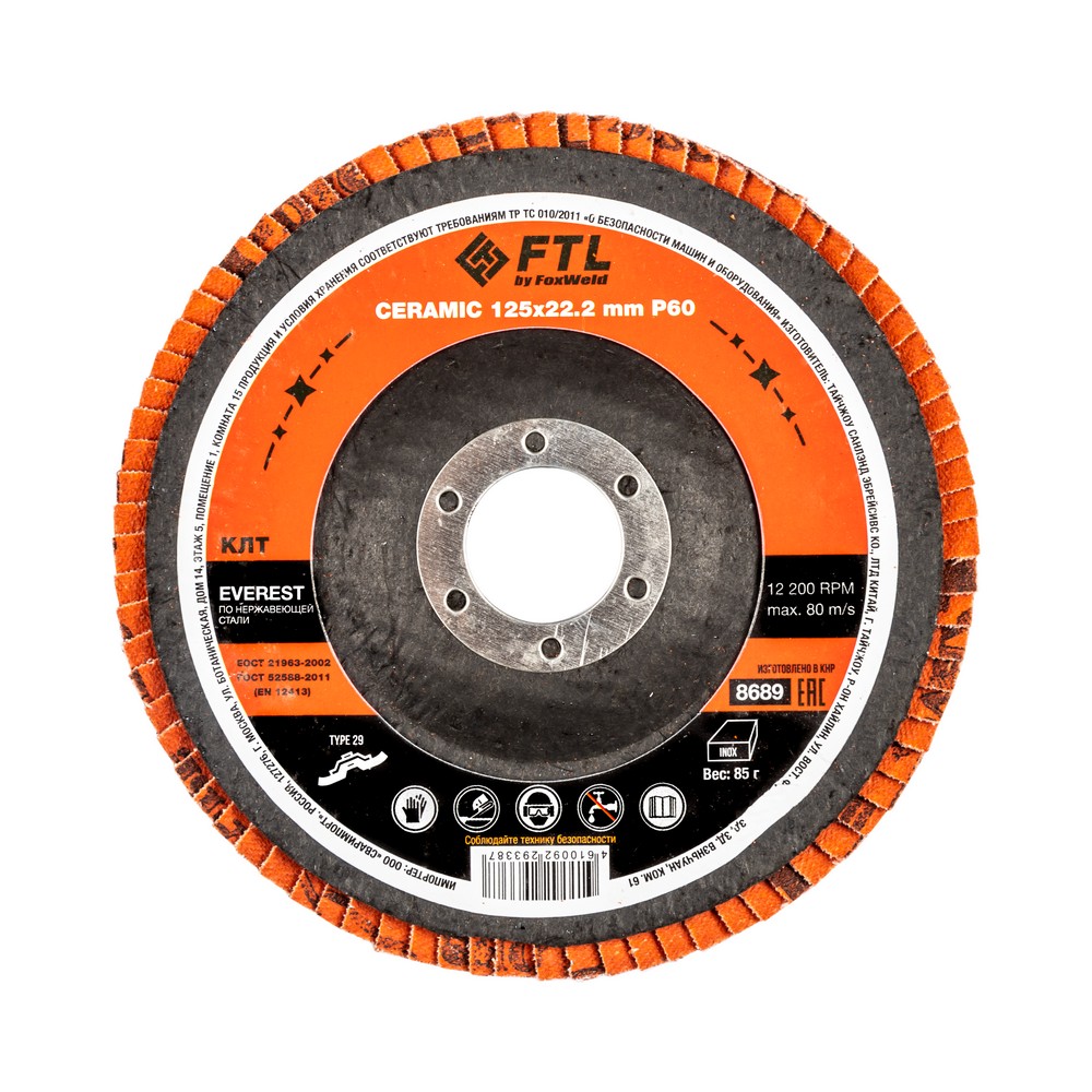 Лепестковый диск для шлифования по нержавеющей стали FTL Everest 29 125 х 22,2 мм P60 – это расходный материал для ручной угловой шлифовальной машины при работе с изделиями из нержавеющей стали, твёрдых сплавов, легированной стали. Диск предназначен для зачистки и шлифовки стальных заготовок, снятия усиления сварного шва, съёма металла, удаления окалины и заусенцев. Коническая форма обеспечивает большое пятно контакта с поверхностью и более агрессивный съём материала. Оптимальный угол работы для конического КЛТ - от 15 до 25 градусов к поверхности. Серия EVEREST — это премиальный инновационный керамический абразив для работы исключительно по изделиям из нержавеющей стали. Электростатический метод нанесения обеспечивает расположение всех абразивных зёрен острыми режущими кромками вверх, перпендикулярно основе. В процессе работы керамические зёрна постоянно сохраняют острую режущую кромку, а отличная теплопроводность керамики наиболее эффективно предотвращает перегрев, что также увеличивает время работы абразива.ИЗНОСОСТОЙКОСТЬ: Благодаря премиальной формуле режущая и шлифовальная способность абразива снижается в процессе работы значительно медленнее, позволяя выполнить больше работы.ЭФФЕКТИВНАЯ РАБОТА С СИЛЬНЫМ ПРИЖИМОМ: Машинная сборка при производстве исключает ошибки при наклеивании лепестков на основание диска, а плотная набивка обеспечивает более сильный прижим во время работы.САМОЗАТАЧИВАЮЩИЙСЯ АБРАЗИВ: Зёрна керамики состоят из ещё более многочисленных и мелких кристаллов по сравнению с оксидом циркония, что обеспечивает ярко выраженный эффект самозатачивания и скалывания в процессе работы. Керамические зёрна постоянно сохраняют острую режущую кромку, а отличная теплопроводность керамики предотвращает перегрев, что также увеличивает время работы абразива. По некоторым исследованиям, керамическое зерно работает в 2 раза агрессивнее, и в 10 раз дольше. чем оксид алюминия.ПРЕМИАЛЬНЫЙ КЕРАМИЧЕСКИЙ АБРАЗИВ: Премиальный компаунд на базе керамического абразива сохраняет остроту режущих кромок до полного износа, не перегревается даже при сильном прижиме и обладает эффектом самозатачивания.ДВОЙНОЕ МЕТАЛЛИЧЕСКОЕ КОЛЬЦО: Двойное металлическое кольцо на диске обеспечивает плотную посадку на фланец УШМ, исключая биения и вибрацию при работе.ПРЕИМУЩЕСТВА:По нержавеющей стали (!)Керамический абразив (лучший по износостойкости и теплопроводности)Минимальное содержание железа, серы, хлораТип 29 (куполообразный, конический)Электростатический метод нанесения абразиваНаилучший эффект самозатачиванияВозможность работы с большим прижимом (требуется мощная УШМ)Двойное металлическое кольцо для плотной посадки на фланец УШМДвойная влагозащитная упаковкаФУНКЦИОНАЛЬНЫЕ ОСОБЕННОСТИ:ГЕРМЕТИЧНОСТЬ УПАКОВКИ: Диски упакованы в специальную термоусадочную герметичную плёнку, которая предохраняет от пыли и влаги при длительном хранении в условиях повышенной влажности, на строительных объектах и крупных промышленных производствах.КОМПЛЕКТАЦИЯ: Круг лепестковый для шлифования по нержавеющей стали FTL Everest 29 125 х 22,2 мм P60 в термоусадочной плёнке со вкладышем в дополнительном ПЭ пакете – 10 шт.