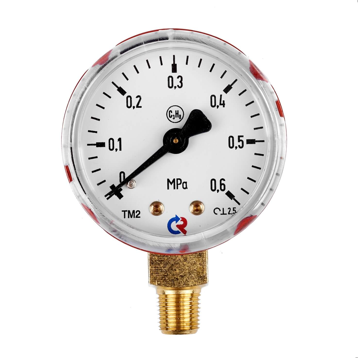 Сварочный манометр для измерений показаний давления пропана от 0 до 0,6 МПа. Манометр используется в пропановых редукторах БПО-5-5 (тип 2).