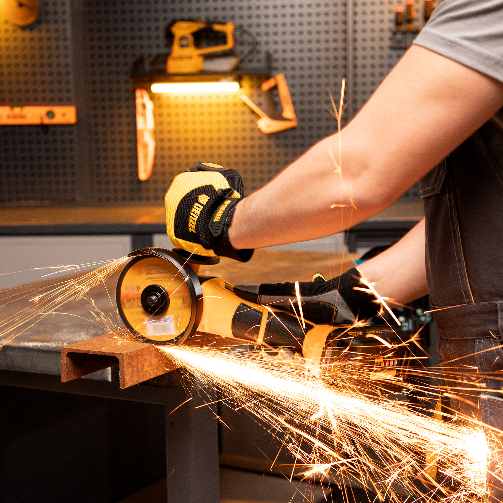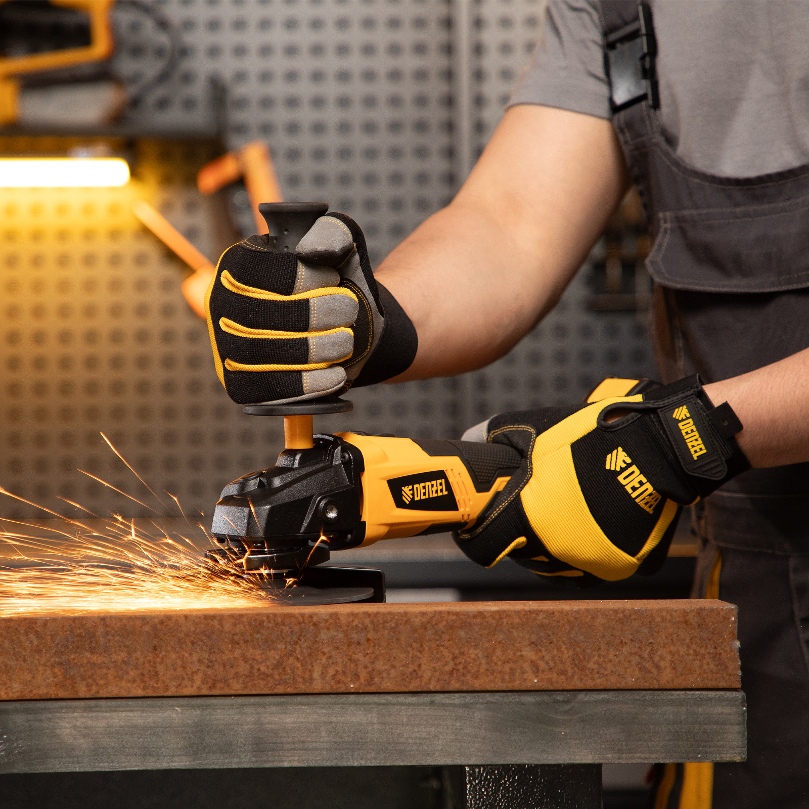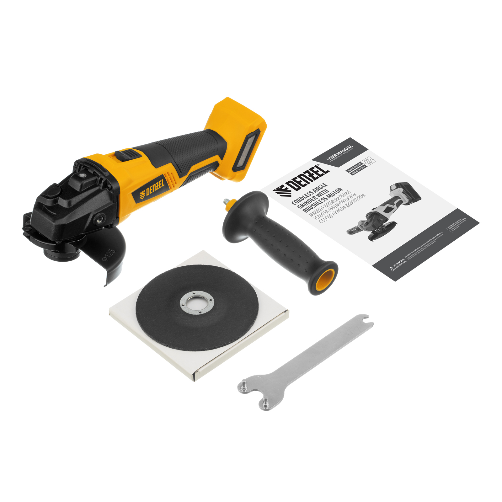 - Универсальность — к УШМ подходит аккумулятор 4Ач Li-ion, совместимый с любым инструментом 18V Denzel battery system серии IB (в комплект поставки не входит).