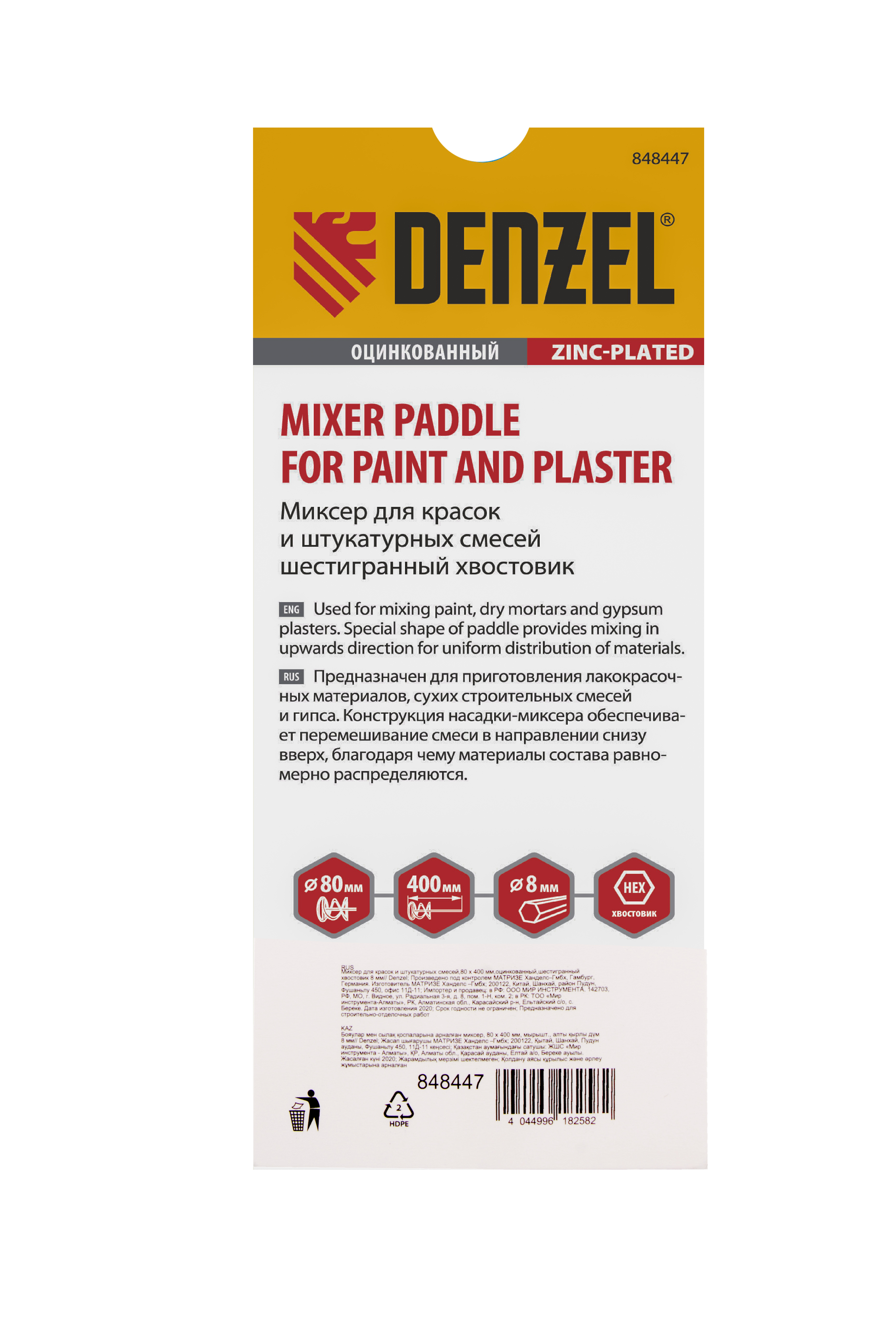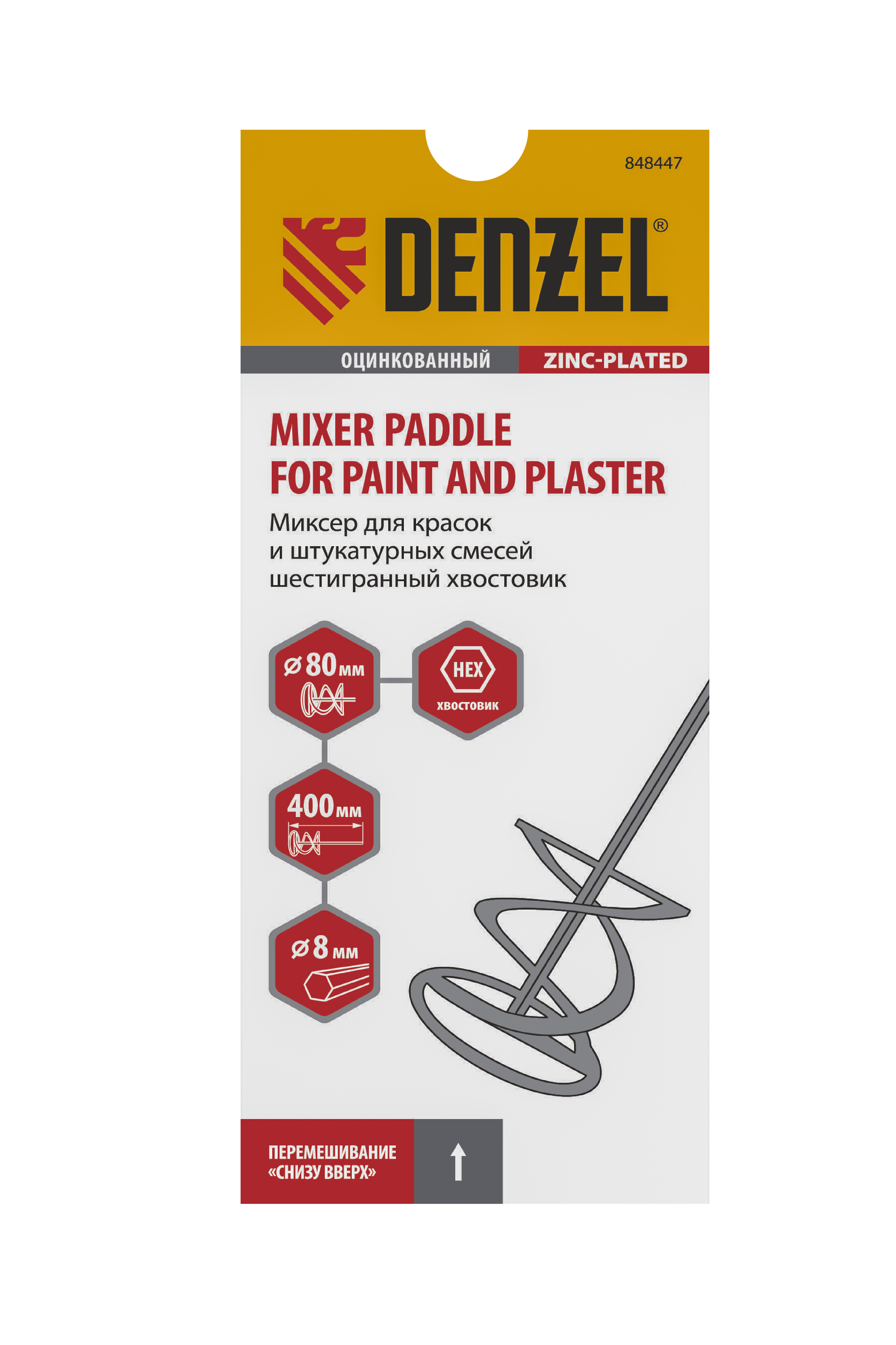 Миксер для красок и штукатурных смесей, 80 х 400 мм, оцинкованный, шестигранный хвостовик 8 мм Denzel в Уфе