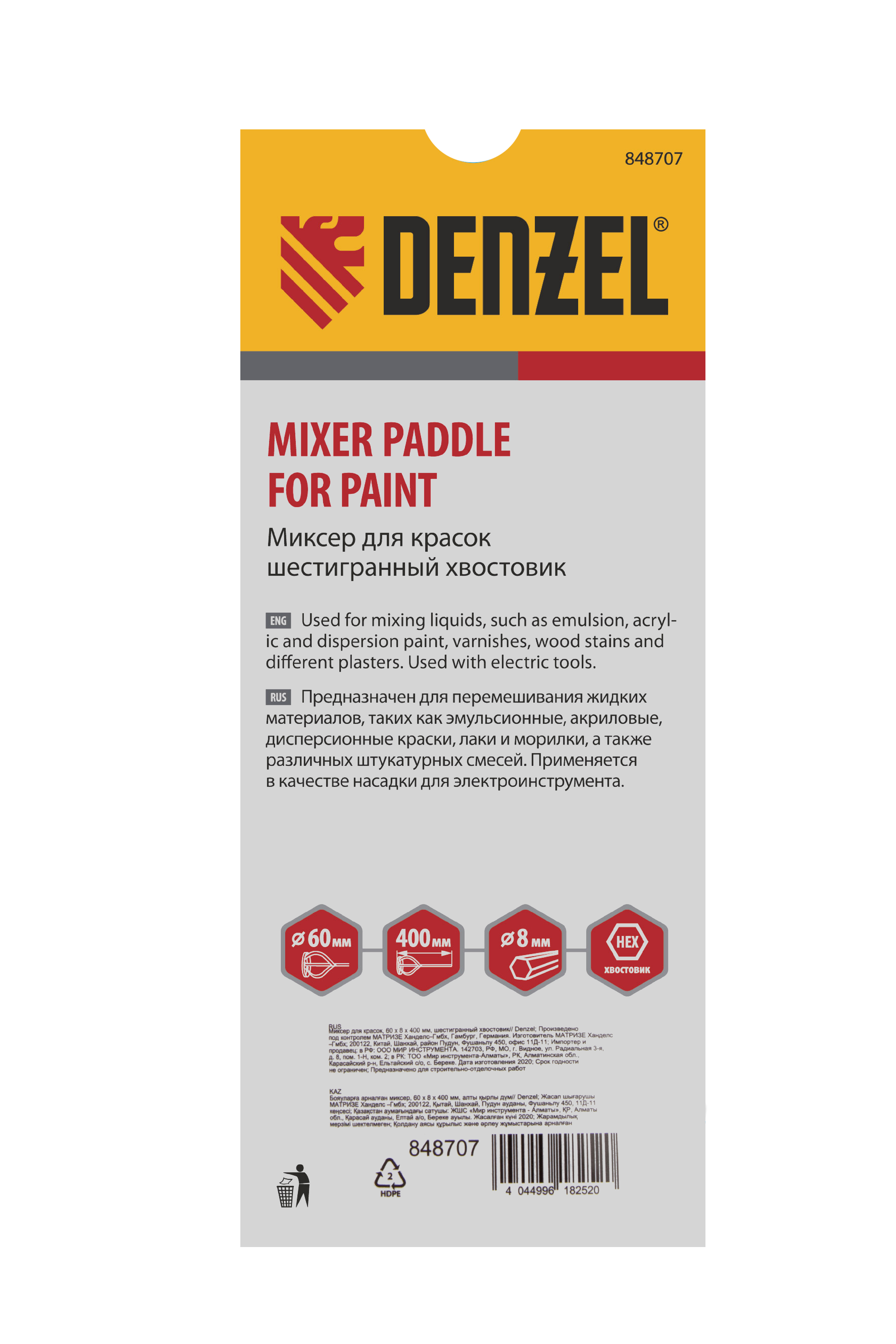 Миксер для красок Denzel 848707 размером 60 х 8 х 400 мм, с шестигранным хвостовиком, — насадка-венчик для электроинструмента, обеспечивающая равномерное перемешивание жидких строительных растворов, например, лакокрасочных материалов, морилок, штукатурно-клеевых смесей. Благодаря продуманной конструкции успешно справляется с поставленными задачами. На конце венчика имеется защитное кольцо, предохраняющее емкость, в которой размешивают раствор, от повреждений. Насадка используется во время проведения отделочных работ.