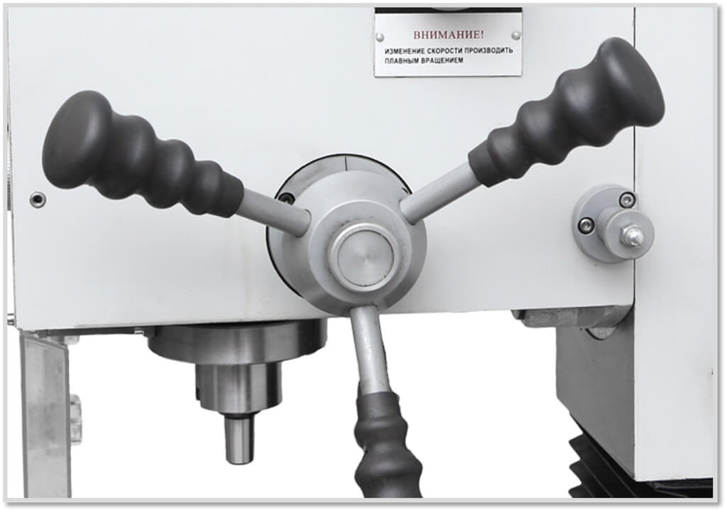 - Привод главного движения станка реализует вращение шпинделя в 2 диапазонах от 50 до 2250 об/мин, количество оборотов шпинделя в данных границах выбирается бесступенчато путем поворота соответствующей ручки на корпусе станка;
