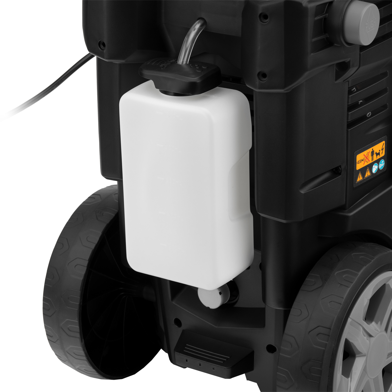 - Использование моющего средства — машина имеет встроенный бачок, также можно подключить внешний пеногенератор, входящий в комплект поставки.