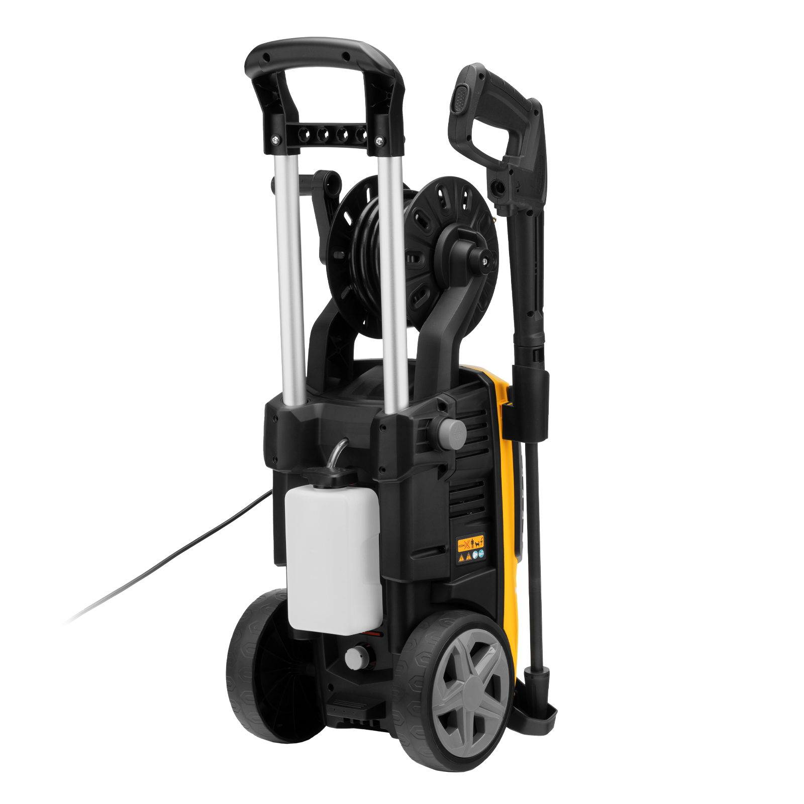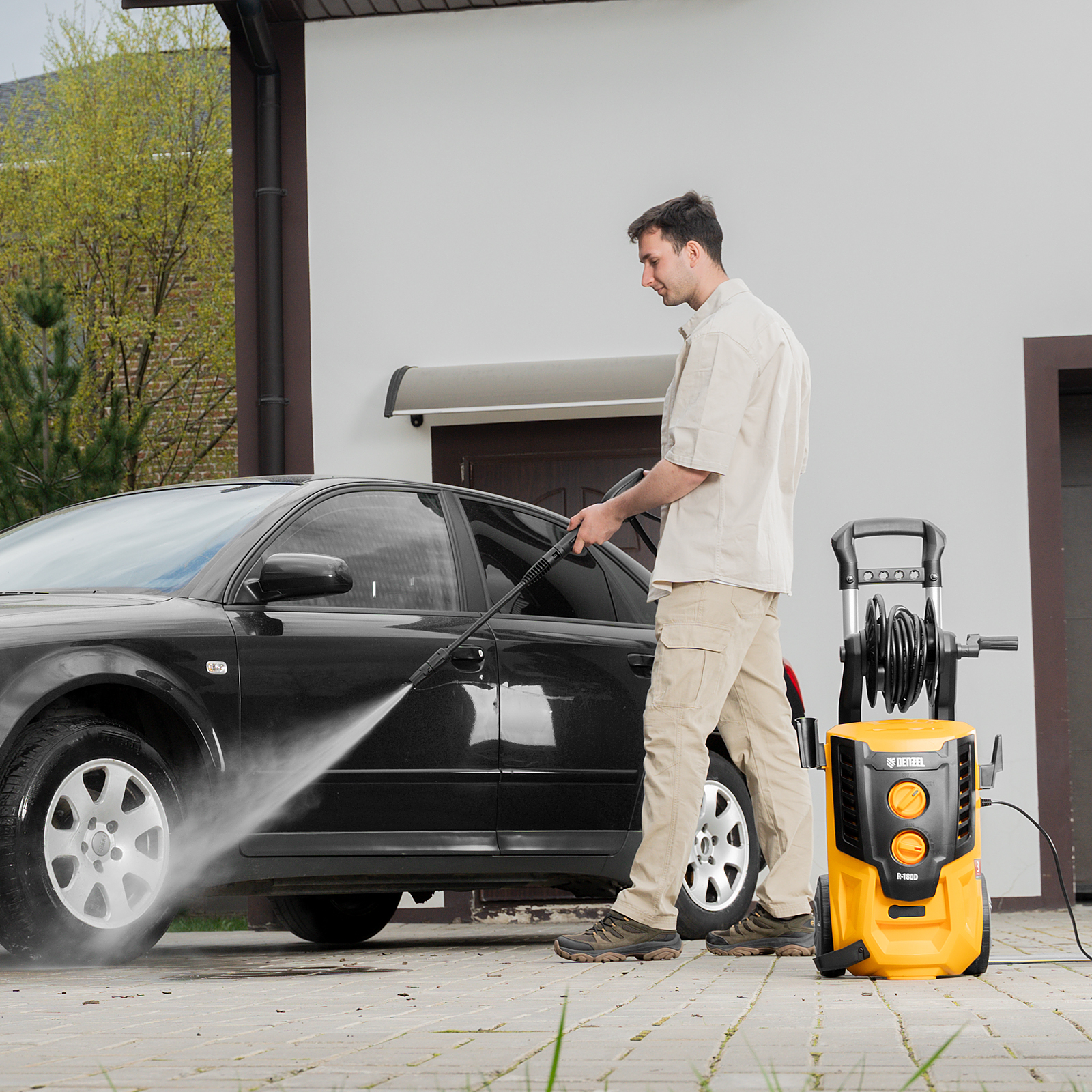 - Увеличенная рабочая зона — шланг длиной 8 м и 7-метровый кабель позволяют свободно перемещаться по участку.