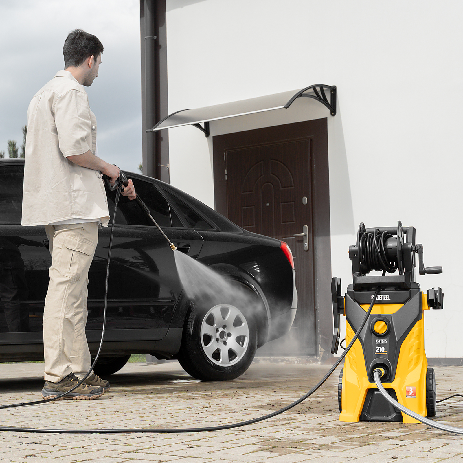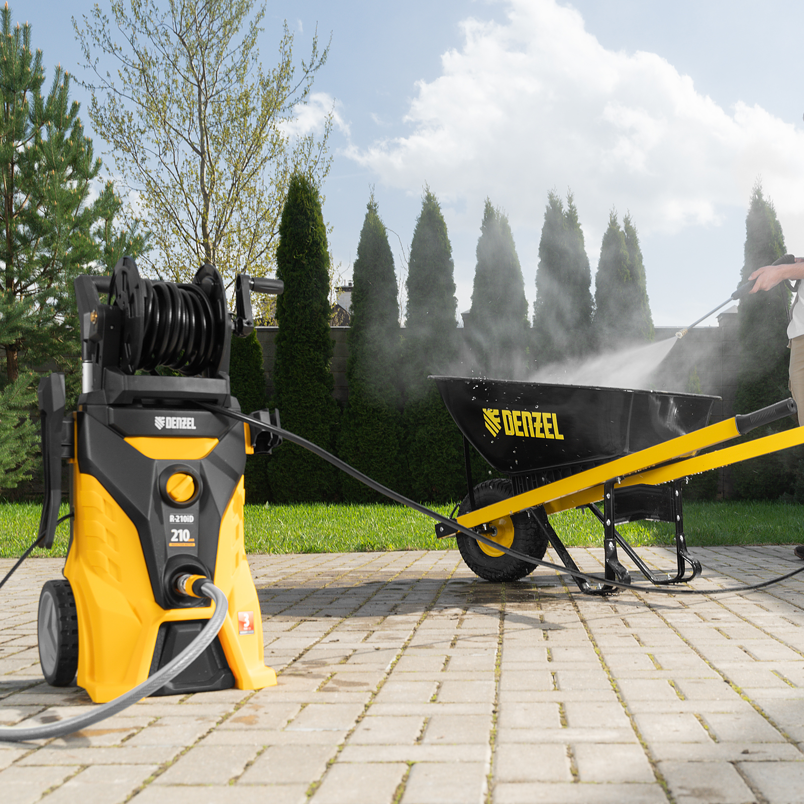 Моечная машина высокого давления Denzel R-210iD с асинхронным двигателем и барабаном для шланга оптимально подходит для очищения автомобилей, заборов, дорожек и садового инвентаря. Эффективно справляться с серьезными загрязнениями позволяют мощный мотор 2600 Вт и помпа с производительностью 8 л/мин и максимальным давлением 210 бар.,Отсутствие водопровода поблизости не станет проблемой. Мойка с насосом может производить забор воды из любых емкостей благодаря функции самовсасывания, при этом теряя не более 5% давления. Алюминиевая помпа со стальными плунжерами отличается высокой точностью подгонки деталей, что обеспечивает надежность и стабильное давление на выходе.