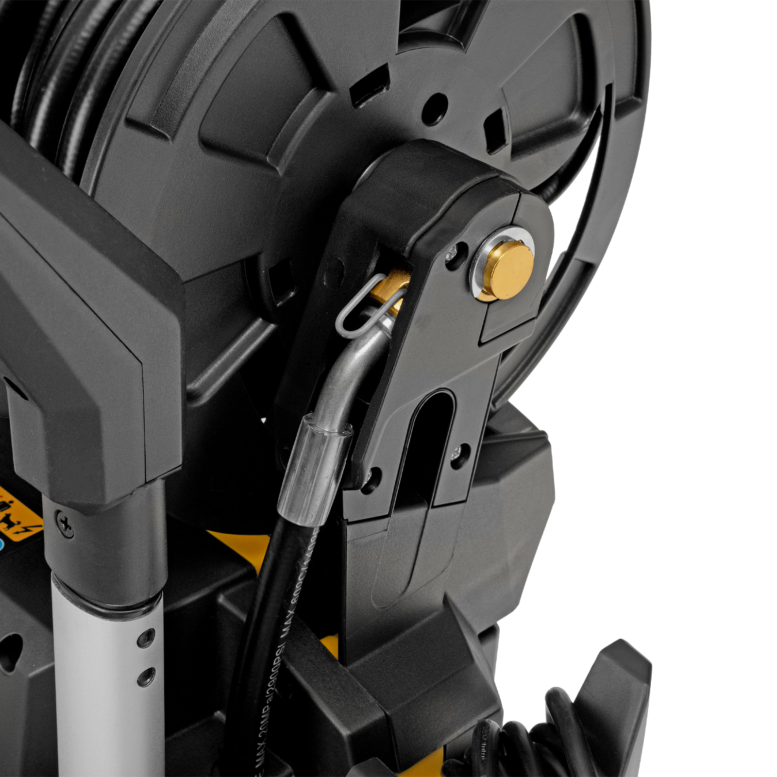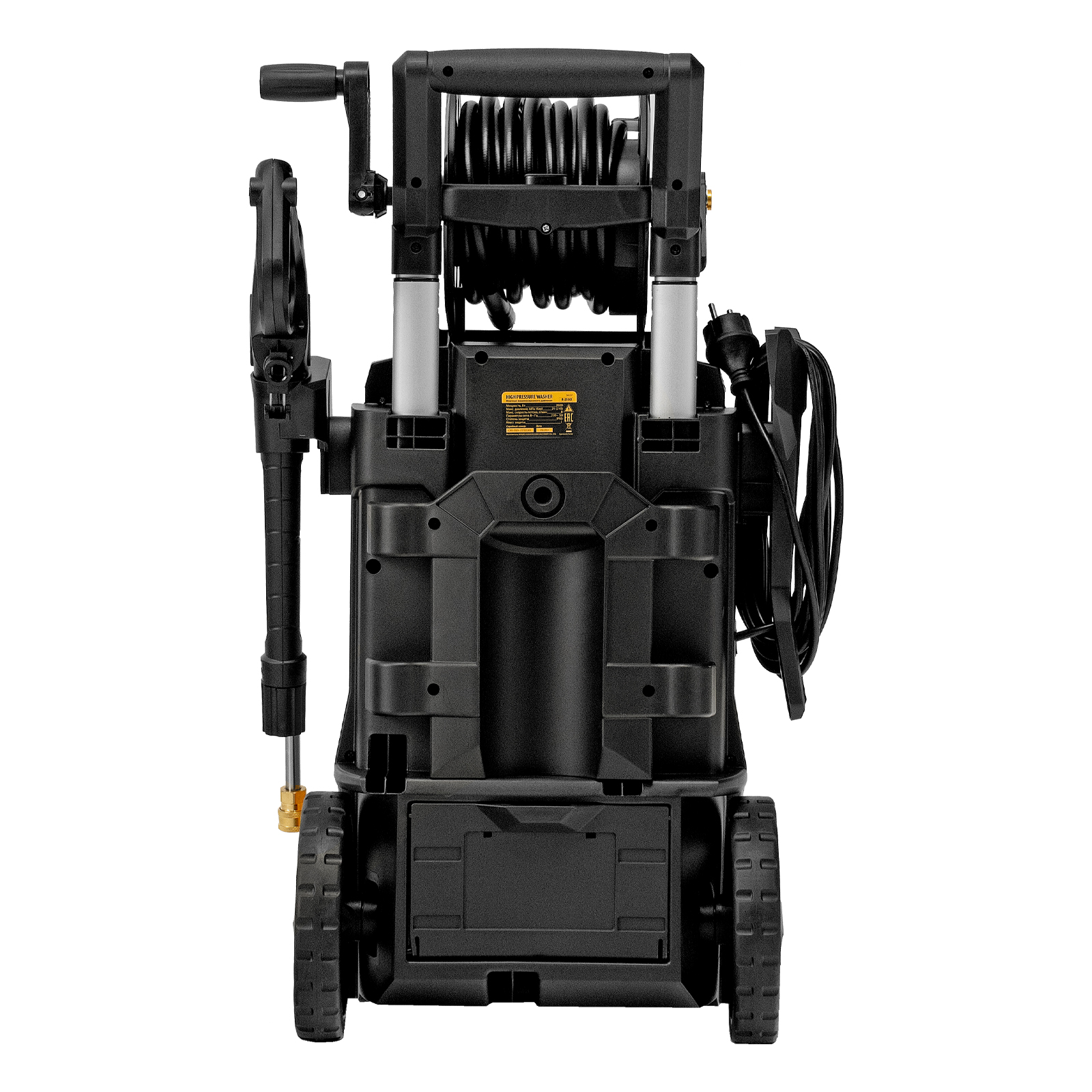 - Комфортная работа — оптимальная длина сетевого кабеля 5 м и увеличенная длина шланга 8 м предотвращают их натяжение, а катушка с ручкой позволяет избежать запутывание шланга и быстро намотать его.