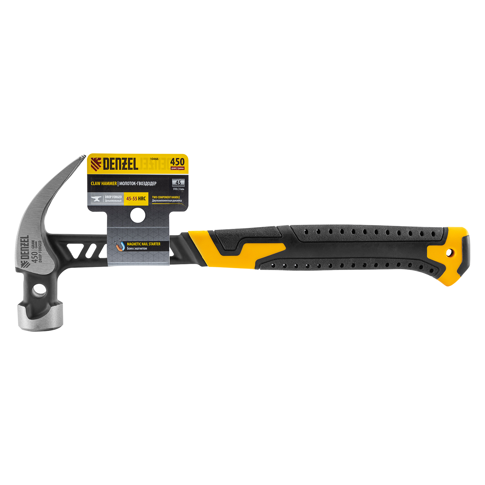 Цельнокованый молоток-гвоздодер Denzel 10466 с бойком весом 450 г, с магнитом и двухкомпонентной обрезиненной рукояткой, предназначен для забивания и извлечения гвоздей. Имеет рабочую часть специальной формы — с круглым бойком и плоским носком с клиновидной прорезью. Магнитный держатель в верхней части бойка позволяет установить гвоздь, не придерживая его рукой, что упрощает работу в труднодоступных местах. Молоток используется в профессиональной сфере, пригодится также и в быту.