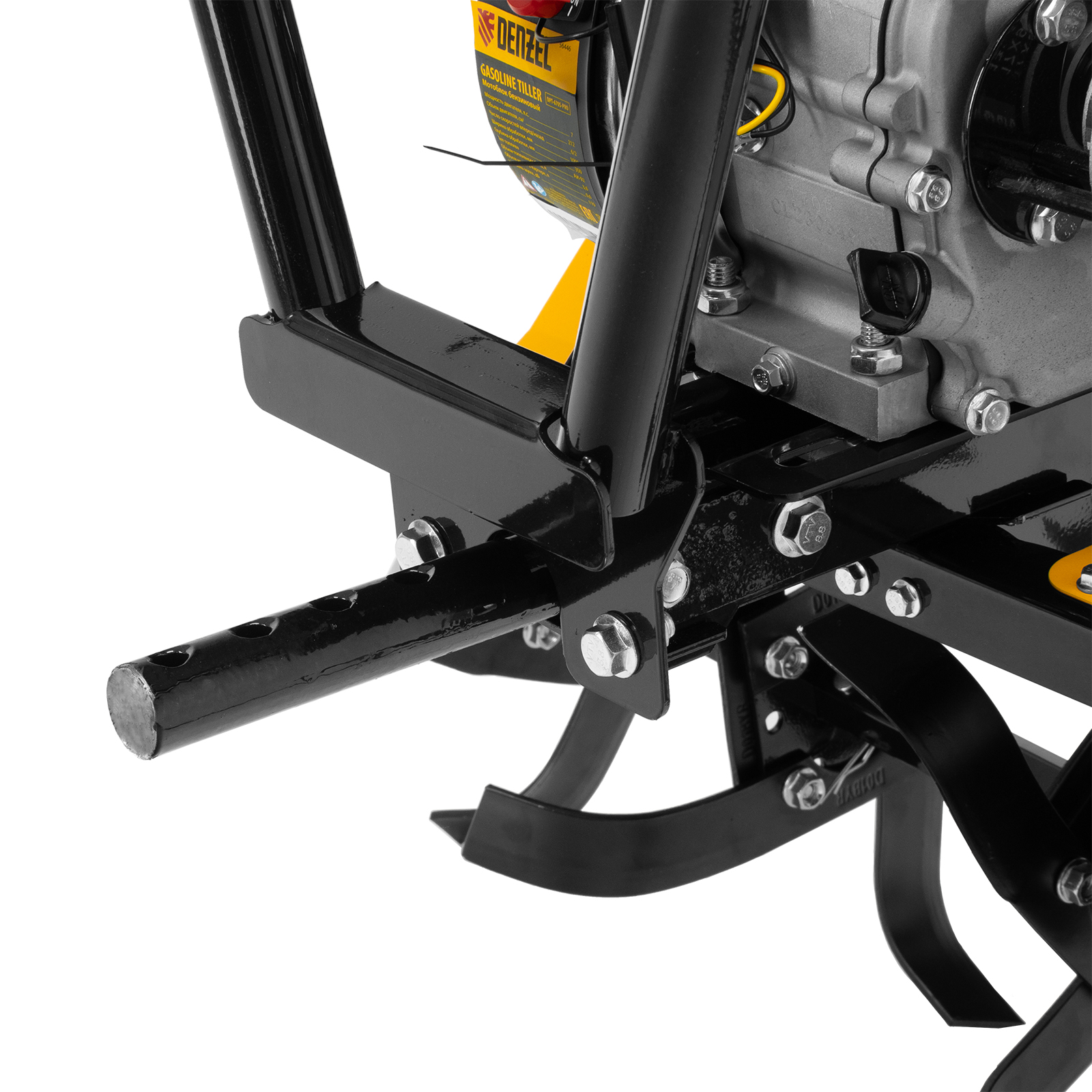 Передний кронштейн диаметром 30 мм позволяет размещать навесное оборудование: грунтозацепы, удлинители осей, картофелевыкапыватель, окучник, плуг или другое. Это позволяет существенно расширить возможности мотоблока и избежать дополнительных расходов на приобретение сельскохозяйственной техники. Мотоблок совместим со всеми моделями навесного оборудования, представленными в ассортименте Denzel (приобретаются отдельно).