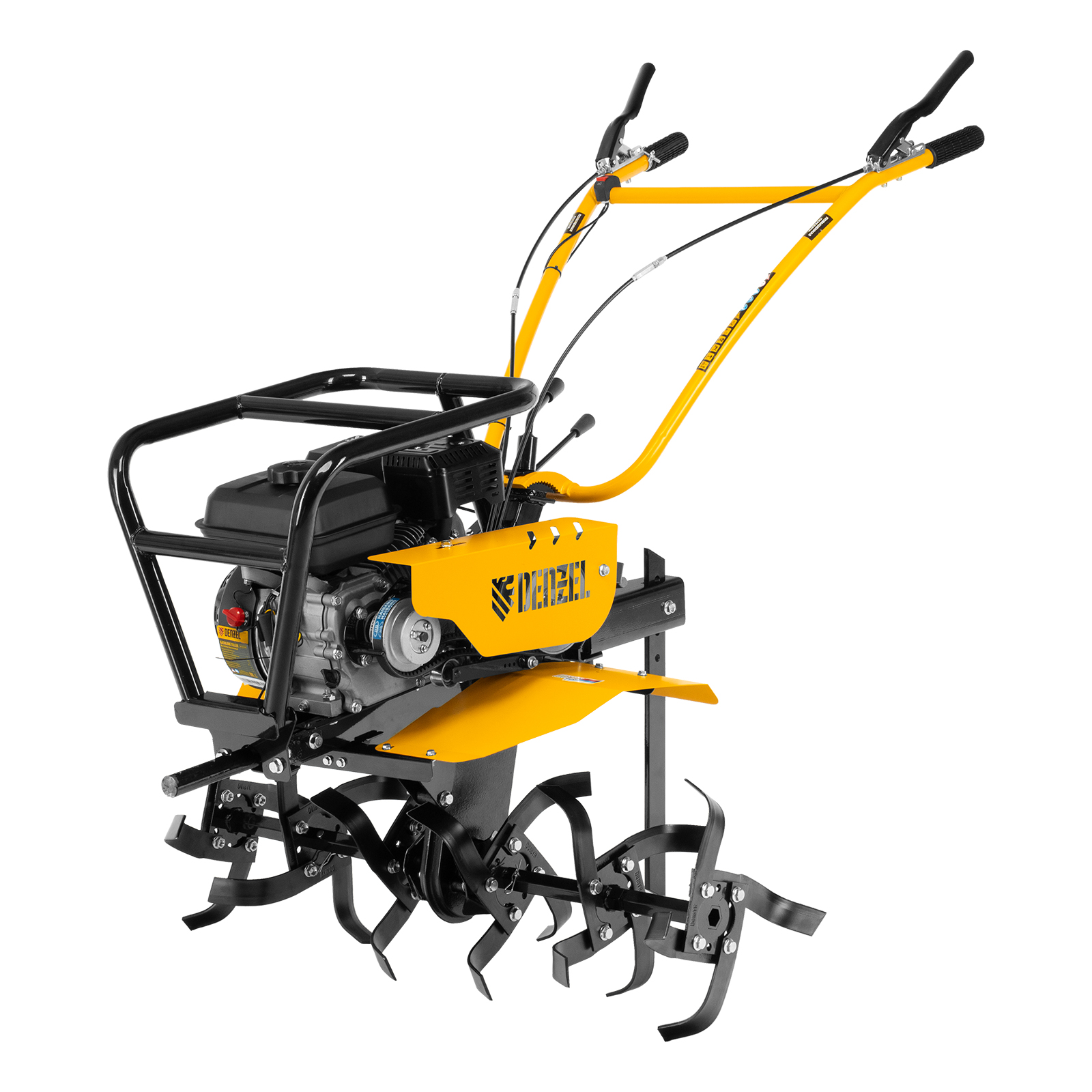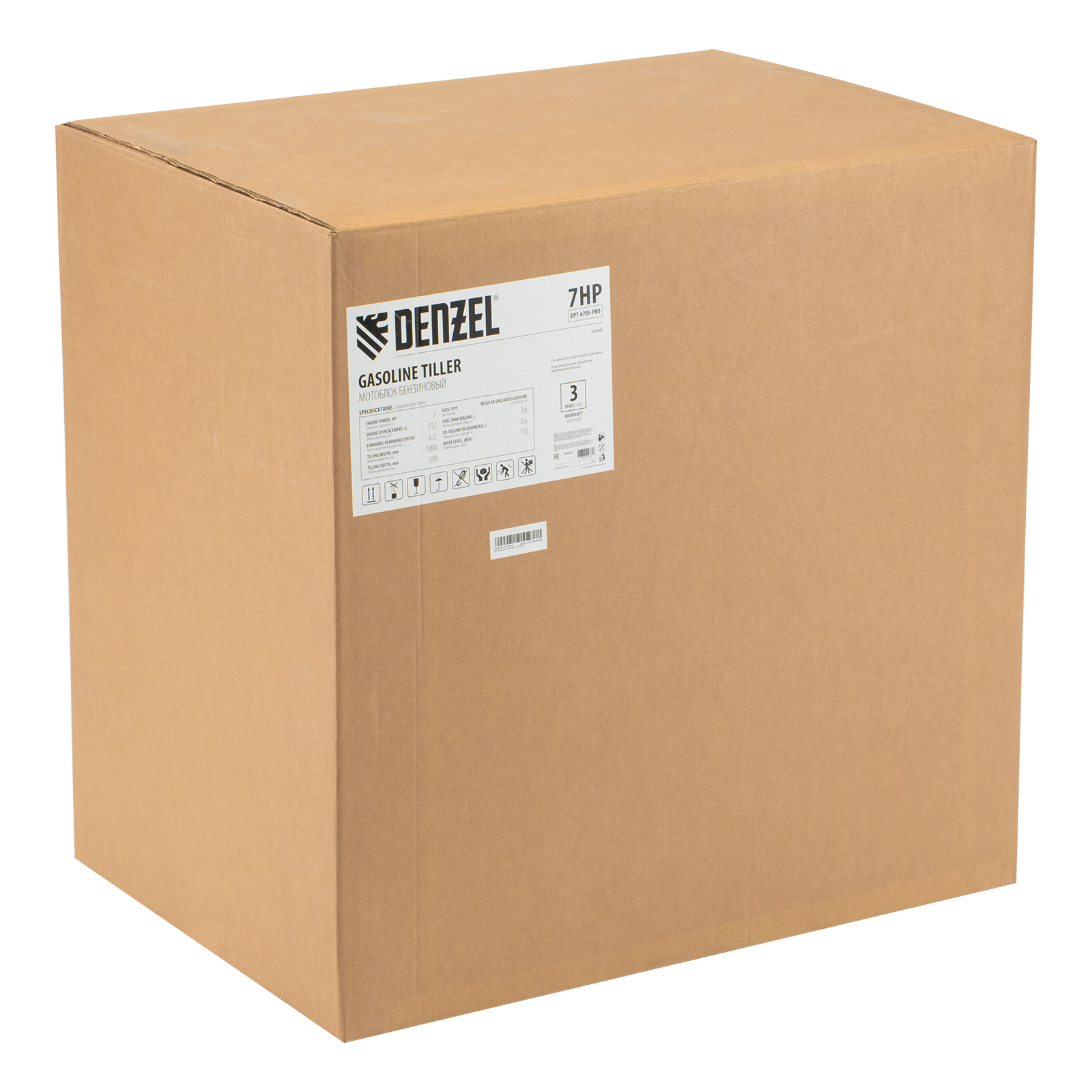 Мотоблок Denzel DPT-670S-PRO 56446 с ременным сцеплением, двигателем объемом 212 см3 и мощностью 7 л.с., с коробкой передач 6 вперед/2 назад и шкивом отбора мощности, комплектуется 24 фрезами (3х4). Предназначен для выполнения земляных работ: прополки, вспахивания, боронования грунта, перевозки грузов и т.д.