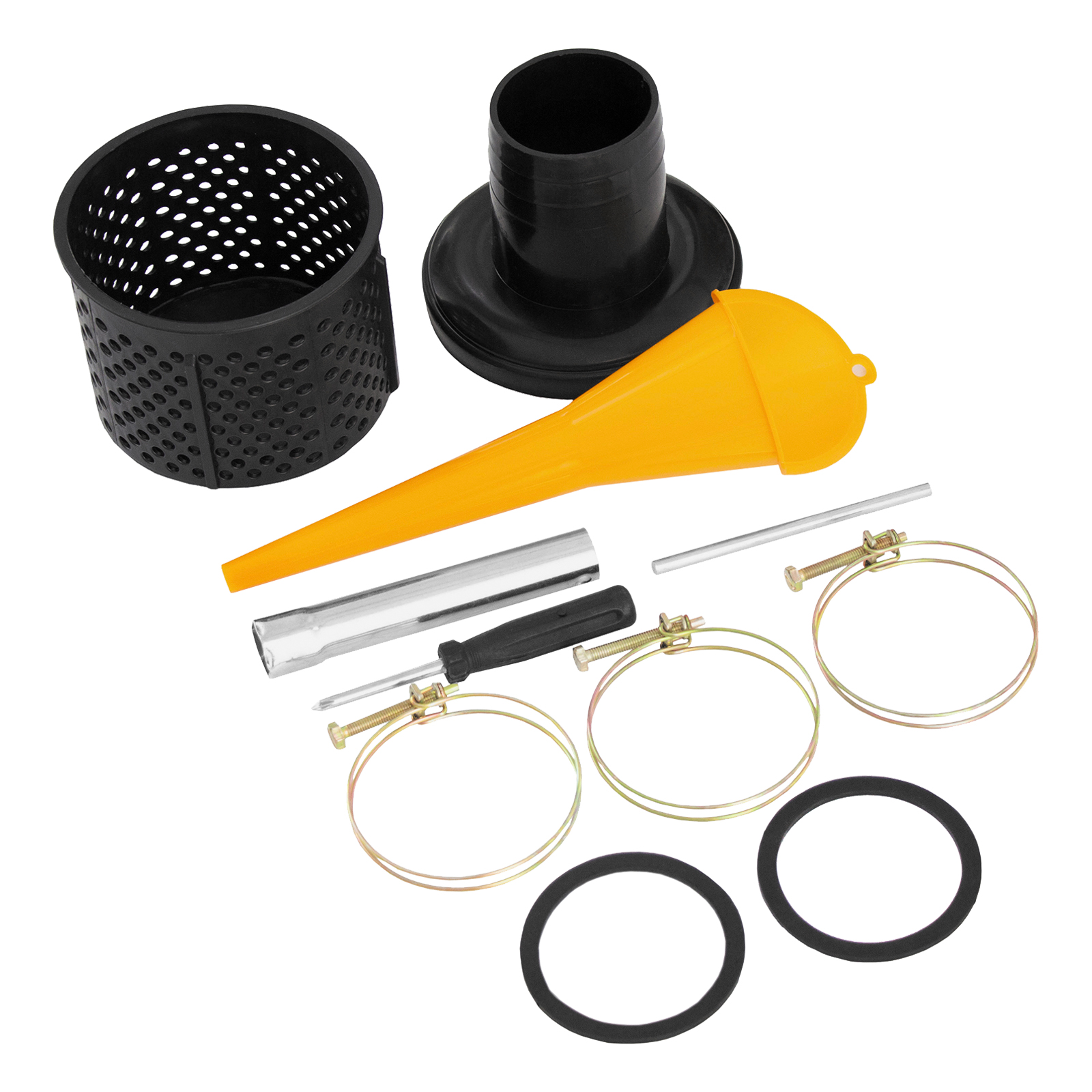 - Продуманная комплектация — к мотопомпе прилагаются хомуты и инструменты для установки патрубков.