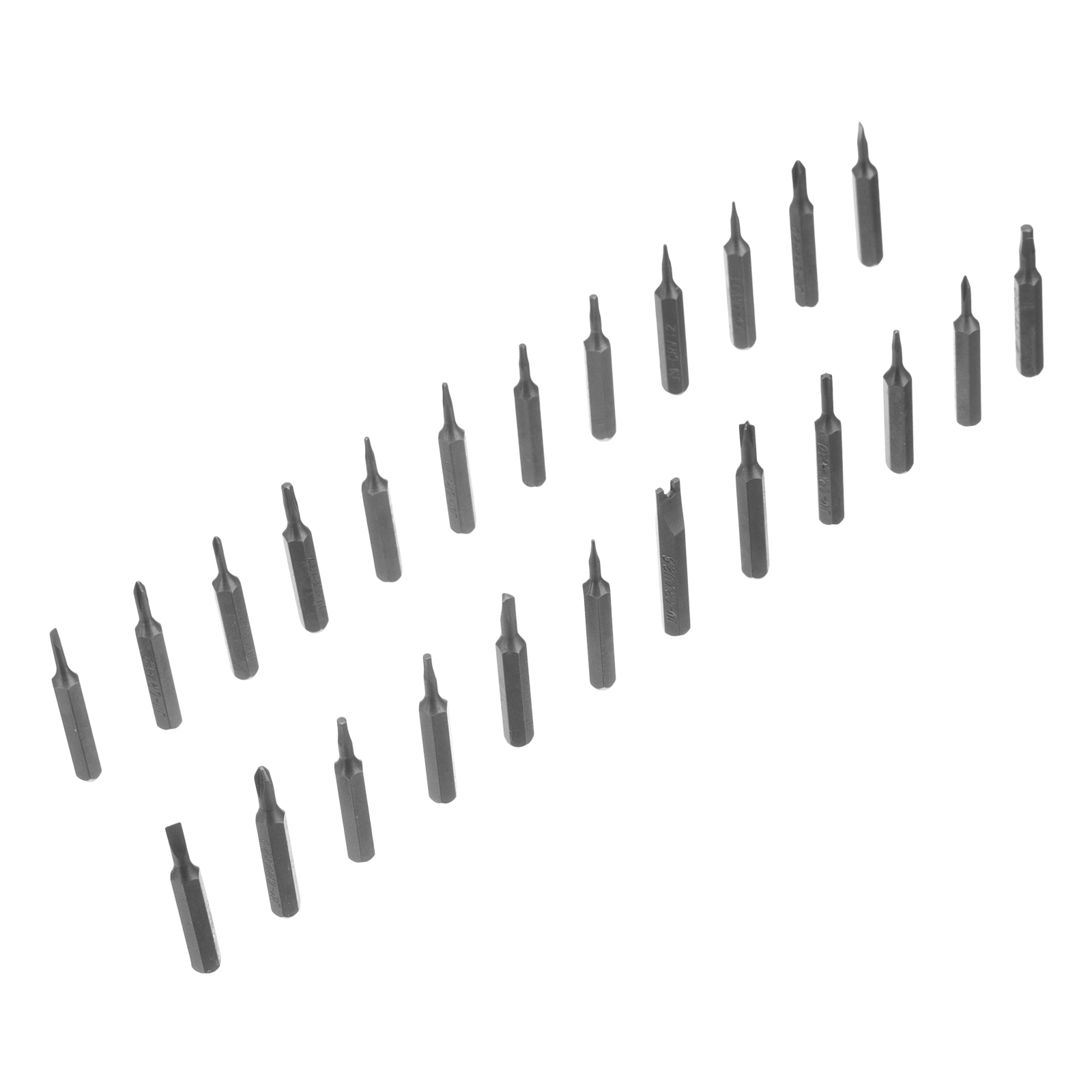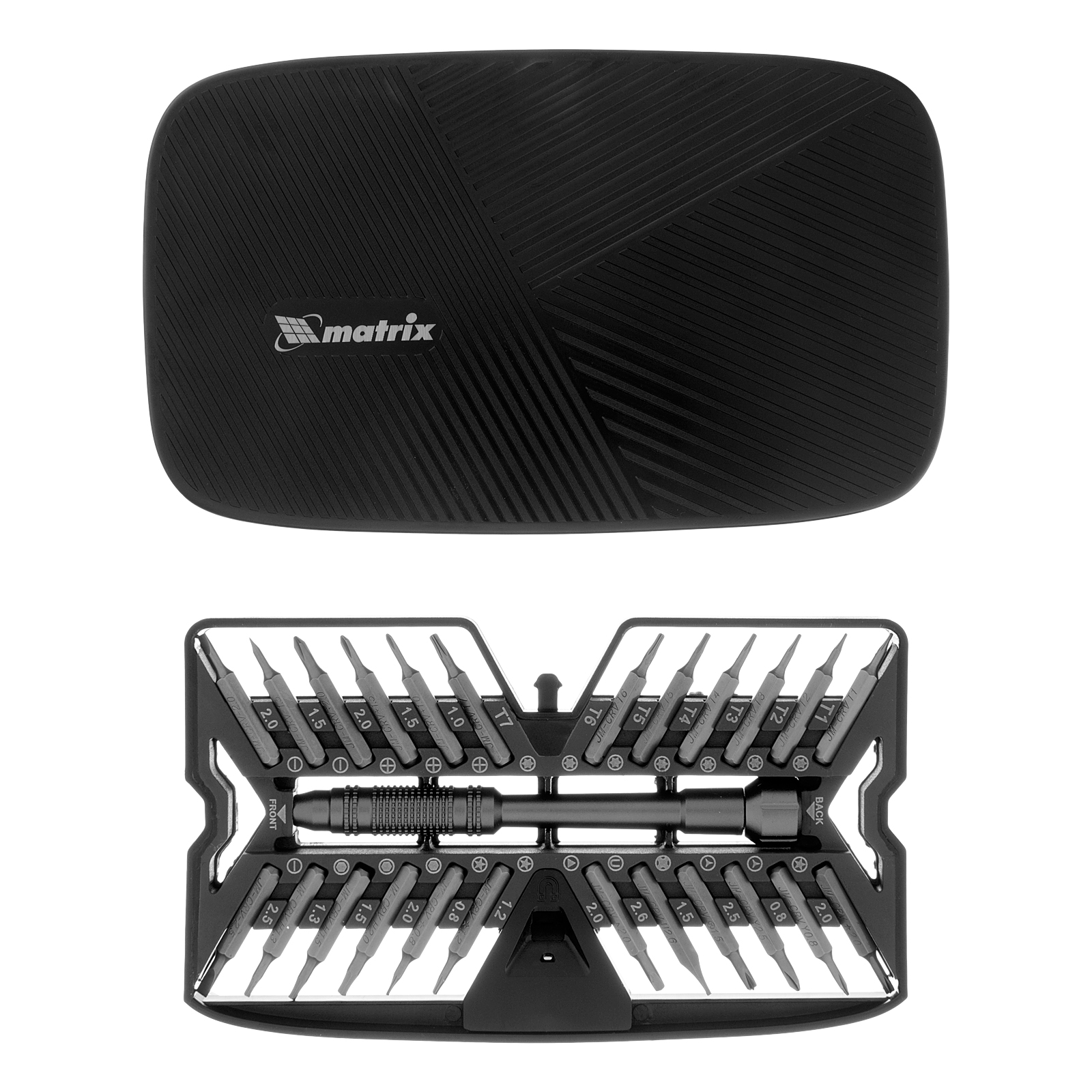 Набор для точных работ 26 в 1 Matrix 13567 содержит 24 биты с наконечниками PH, SL,T, H, Str, Y, St, TR, U, отвертку и пластиковый кейс. С его помощью можно отремонтировать очки, игрушки, портативную и бытовую технику и т.д.
