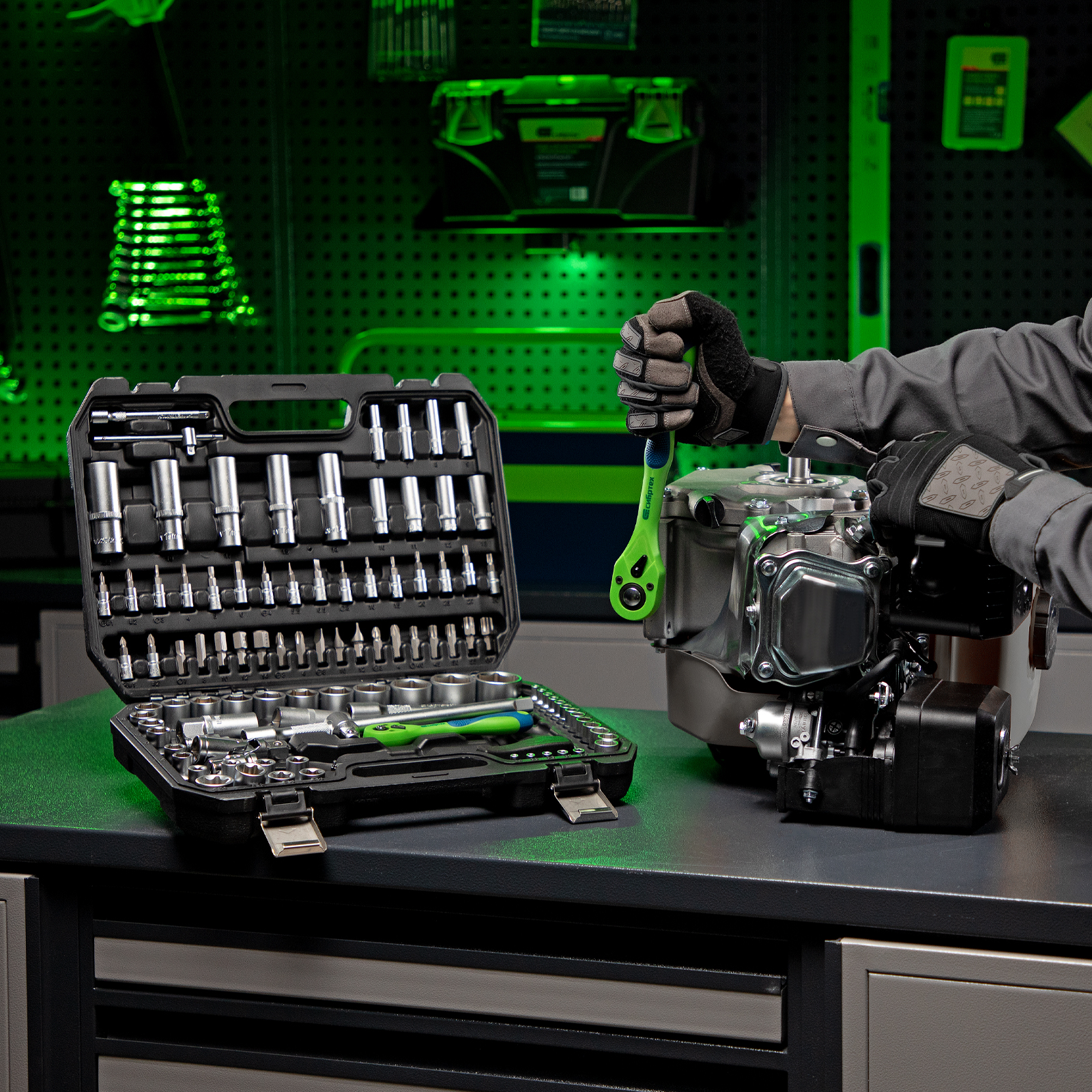 - Прочность и износостойкость — элементы набора изготовлены из хромованадиевой стали, корпус каждого трещоточного ключа имеет защитное покрытие.