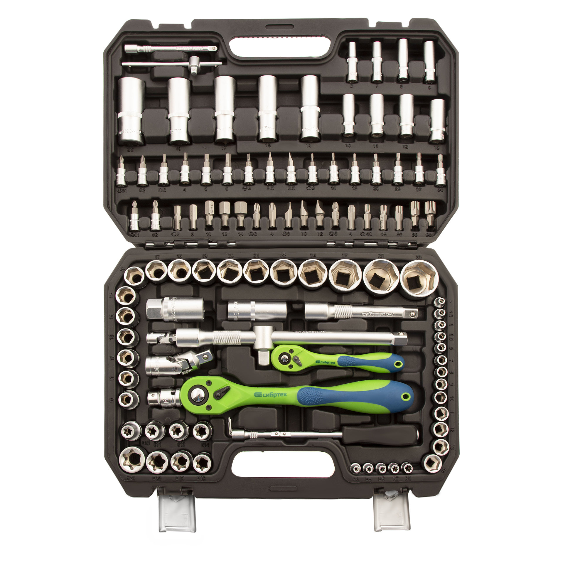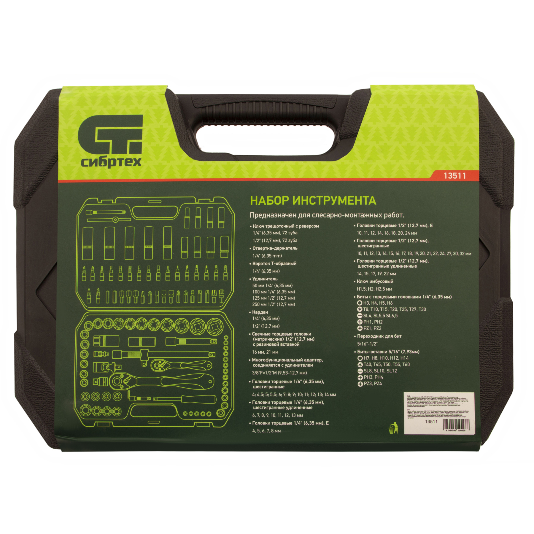 Набор инструментов Сибртех 13511 состоит из 108 предметов из стали CrV, с присоединительными размерами 1/2" и 1/4", предназначенных для монтажа и демонтажа резьбового крепежа с разными типами шлицев. В комплект поставки входят карданы, удлинители и переходники, облегчающие работу в труднодоступных местах. Набор используется для ремонта автомобилей, а также полезен в быту.