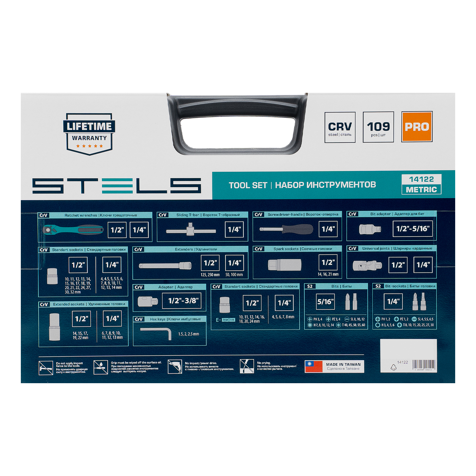 Набор инструментов Stels 14122 в ударопрочным пластиковом кейсе состоит из 109 предметов с присоединительными квадратами 1/2″ и 1/4″, из стали CrV и S2, и предназначен для выполнения слесарно-монтажных работ. Включает инструменты и насадки для работы с резьбовыми крепежами, в том числе 12-гранные торцевые головки, т-образный вороток и удлинители, облегчающие работу в труднодоступных местах. Набор предназначен для профессионального использования в автомастерской, будет полезен и для решения бытовых задач.