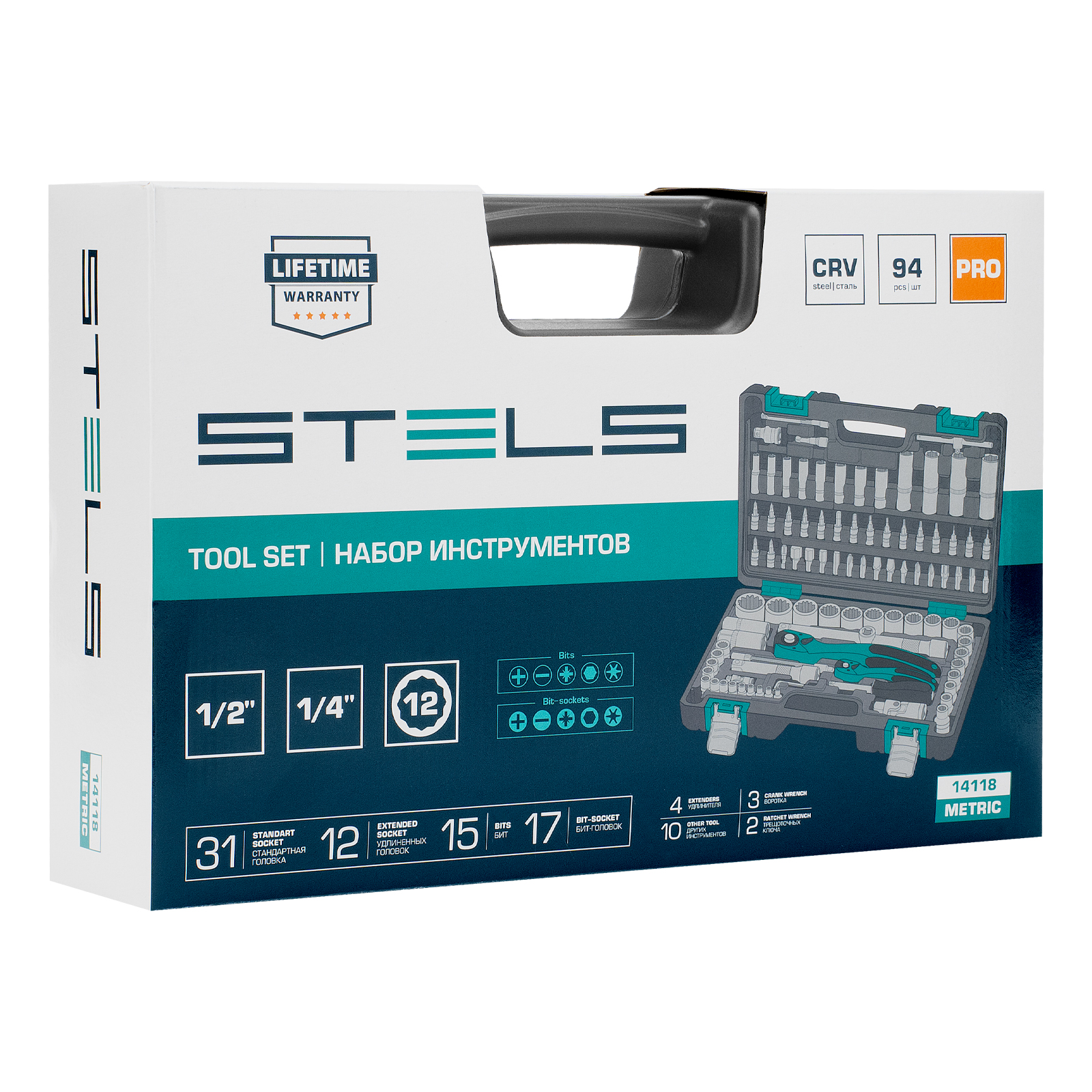 Набор инструментов 1/2", 1/4", CrV, 12 гранные головки, пластиковый кейс, 94 предмета Stels в Уфе