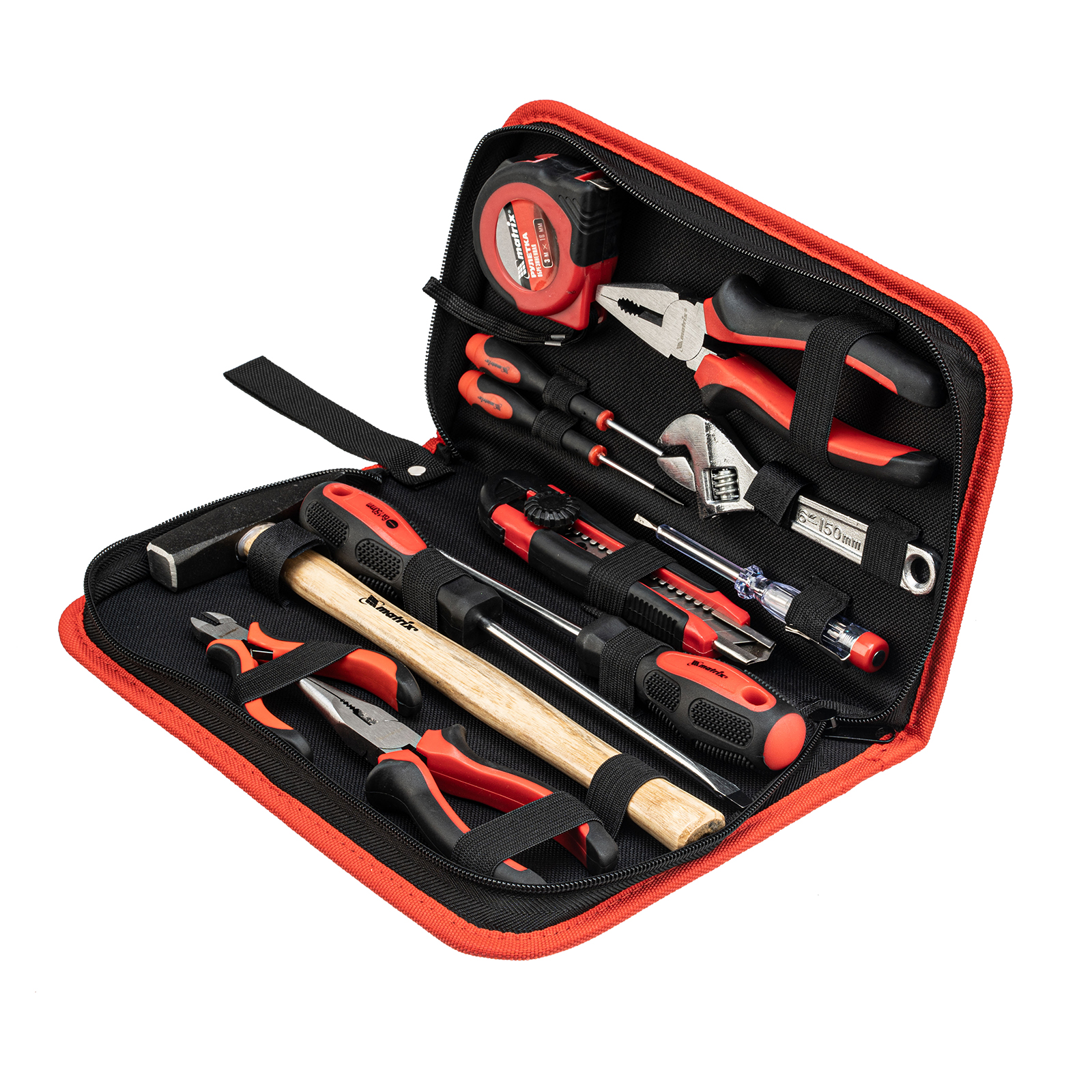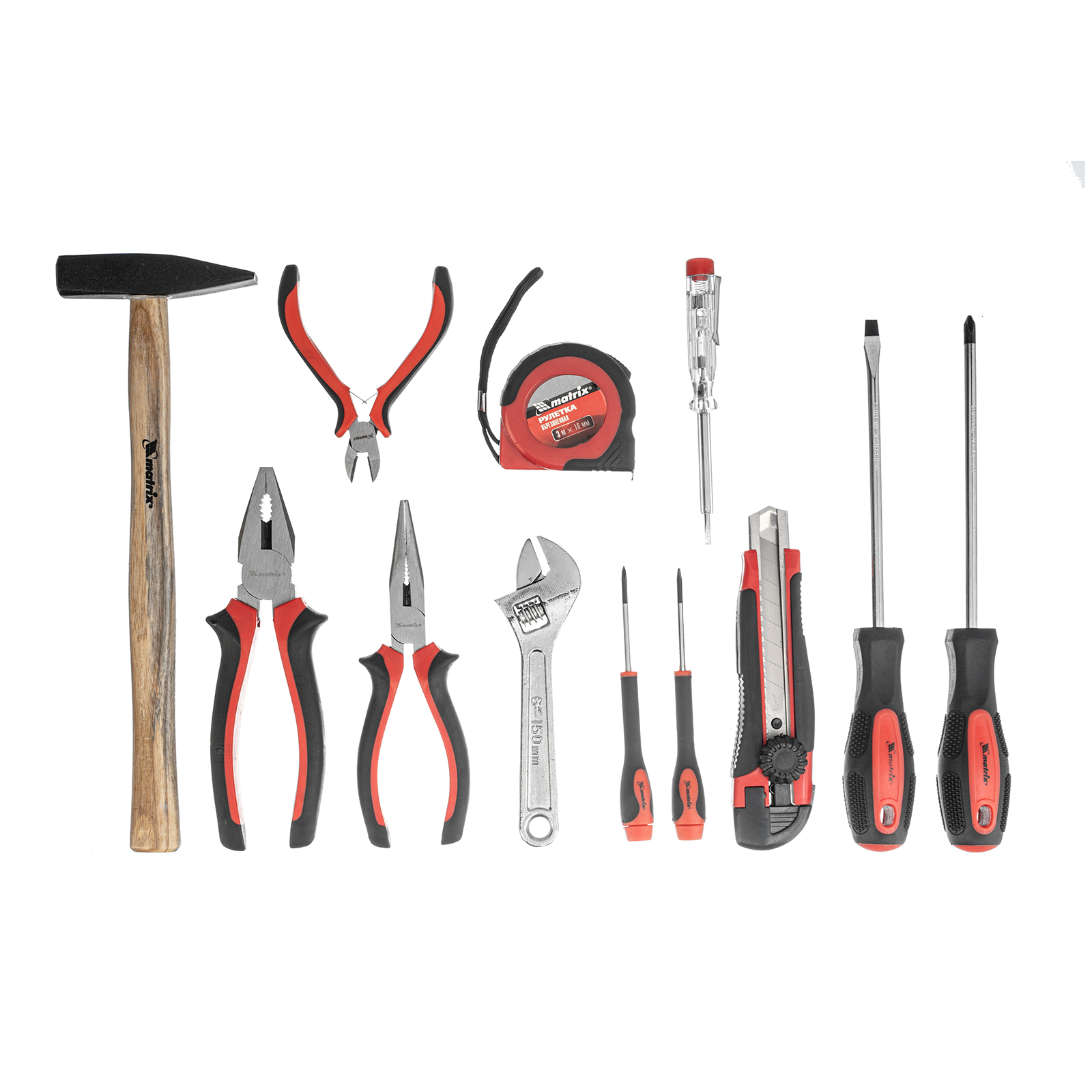 Набор Matrix 13562 из 12 предметов будет полезен как частному мастеру, так и профессионалу для проведения слесарно-монтажных работ. Он включает отвертки для монтажа/демонтажа резьбовых соединений, в том числе и мелких, разводной ключ для болтов и гаек, нож для резки плотных материалов, рулетку для проведения замеров, молоток, кусачки и тестер для проверки напряжения в сети.