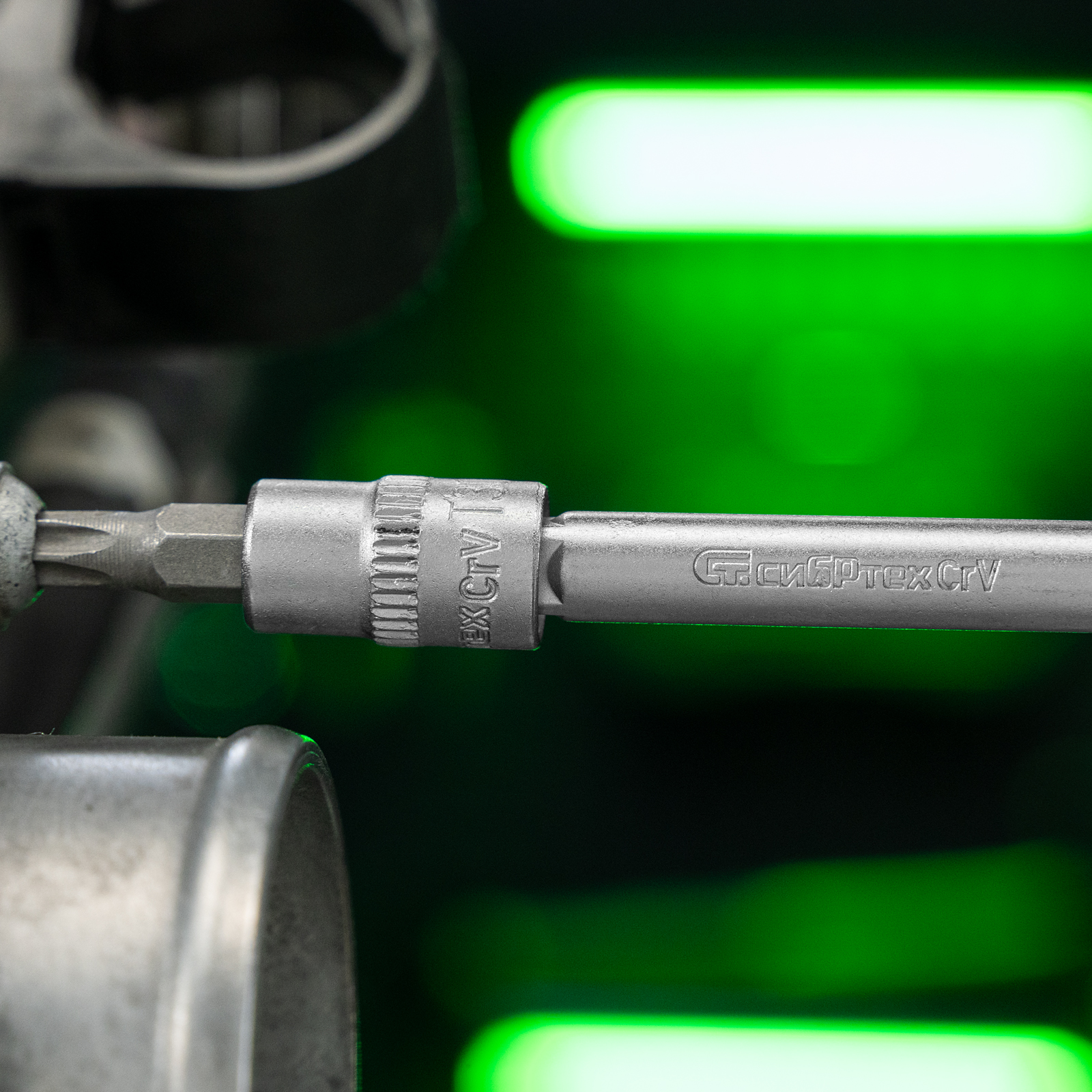 - Прочная фиксация — шариковый замок на трещотках, воротках, шарнирах и удлинителях надежно удерживает головки.