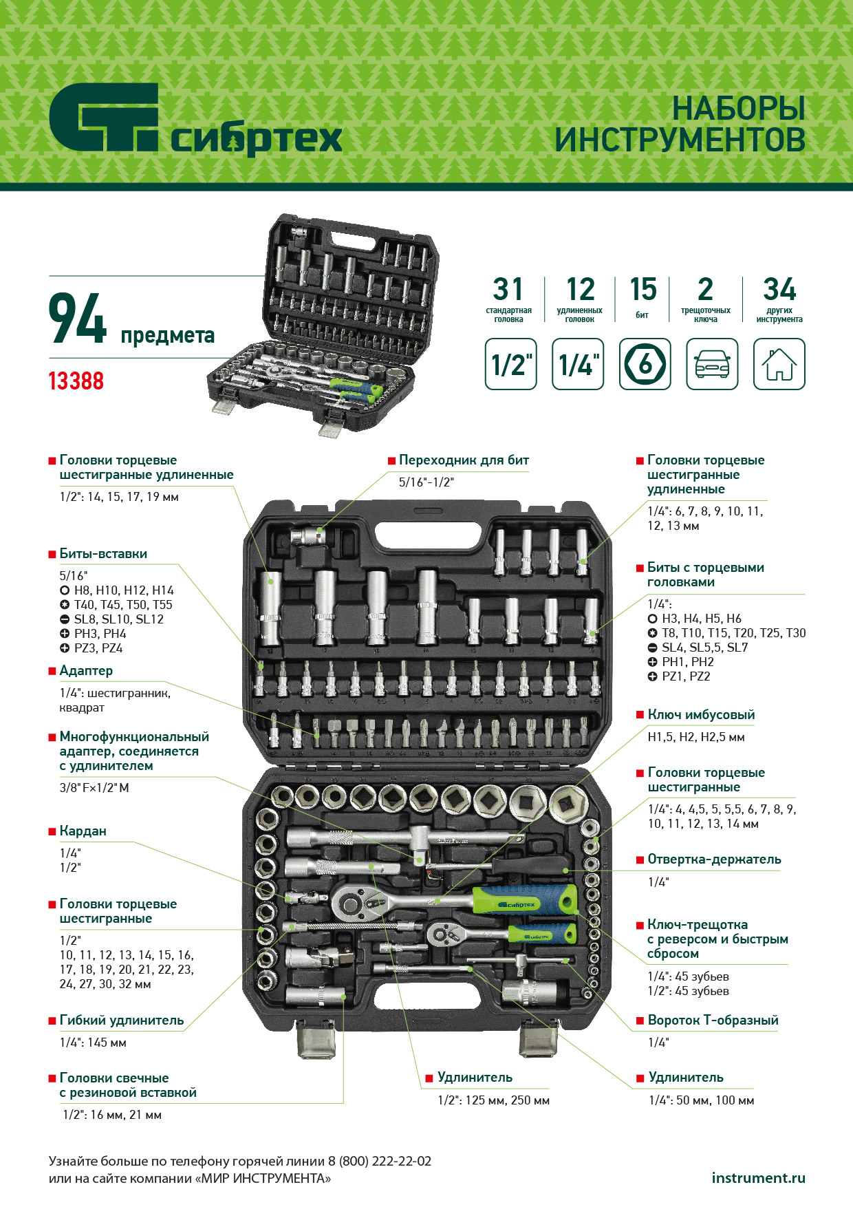 Набор инструментов Сибртех 13388 упакован в пластиковый кейс и состоит из 94 предметов с присоединительным размером 1/2" и 1/4", предназначенных для монтажа и демонтажа резьбового крепежа с разными типами шлицев. В комплект поставки входят карданы, удлинители и переходники, облегчающие работу в труднодоступных местах. Набор используется для ремонта автомобилей, а также полезен в быту.
